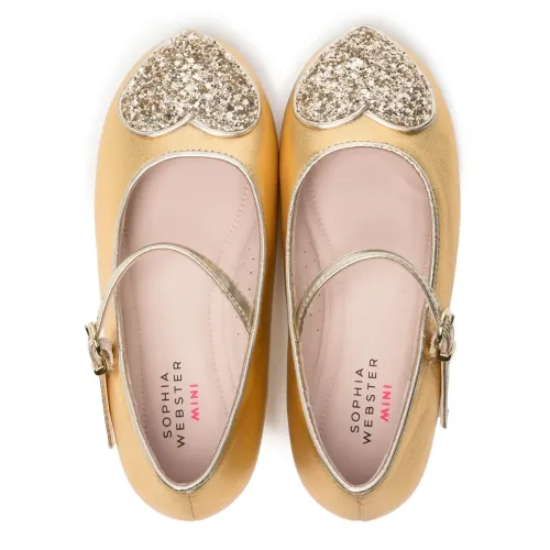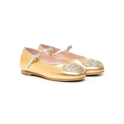 Золотистый, телячья кожа, блестящий материал, нашивка в форме сердца, закругленный носок, застежка на пряжке и ремешке, стелька с логотипом и плоская резиновая подошва.