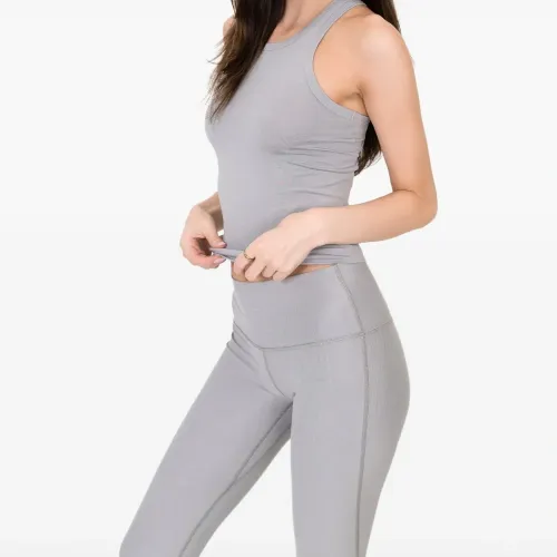 серый топ с американской проймой, круглым вырезом и логотипом на спине