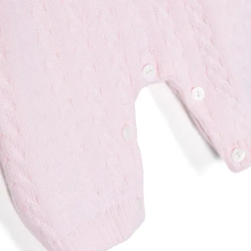 Светло-розовый, необработанная шерсть, фактурная вязка, воротник Питер Пэн, длинные рукава, длина макси и застежка на пуговицы.