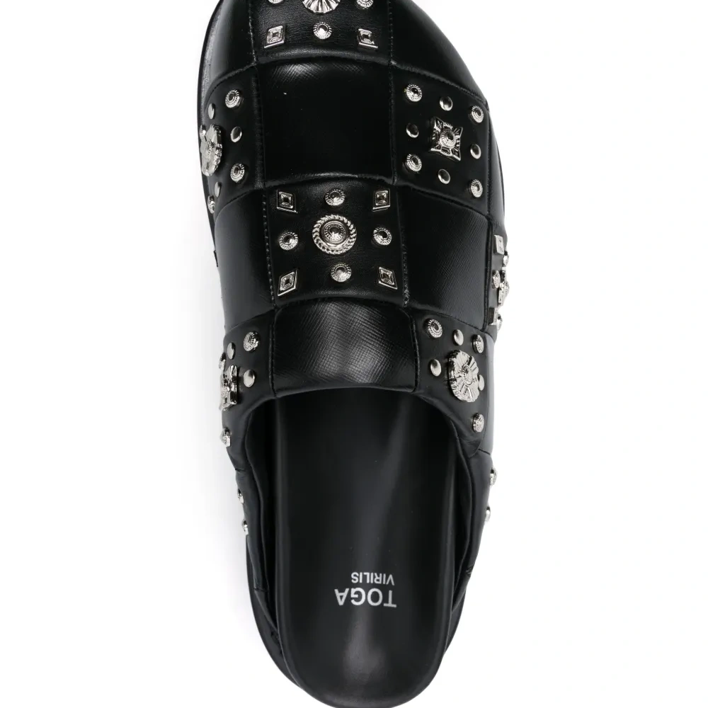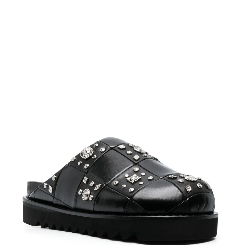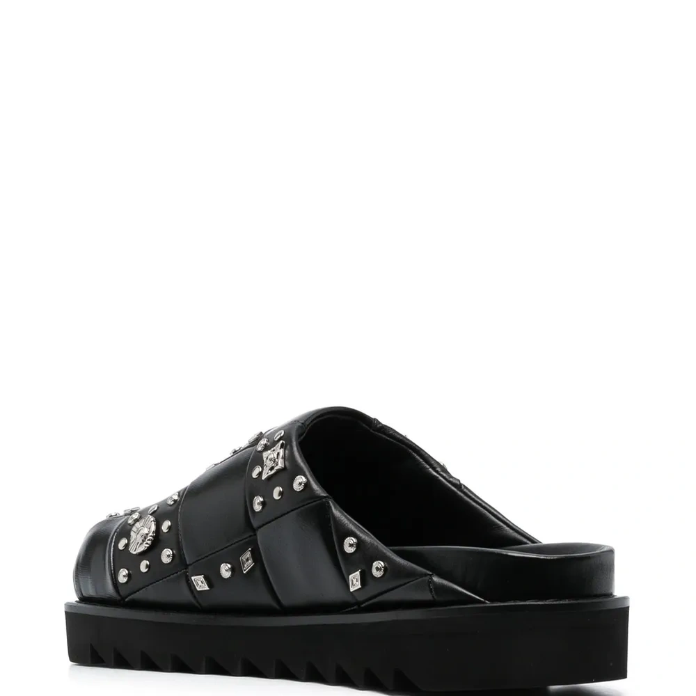 Черный, телячья кожа, серебристые заклепки, миндалевидный носок, логотип на стельке и плоская резиновая подошва.
