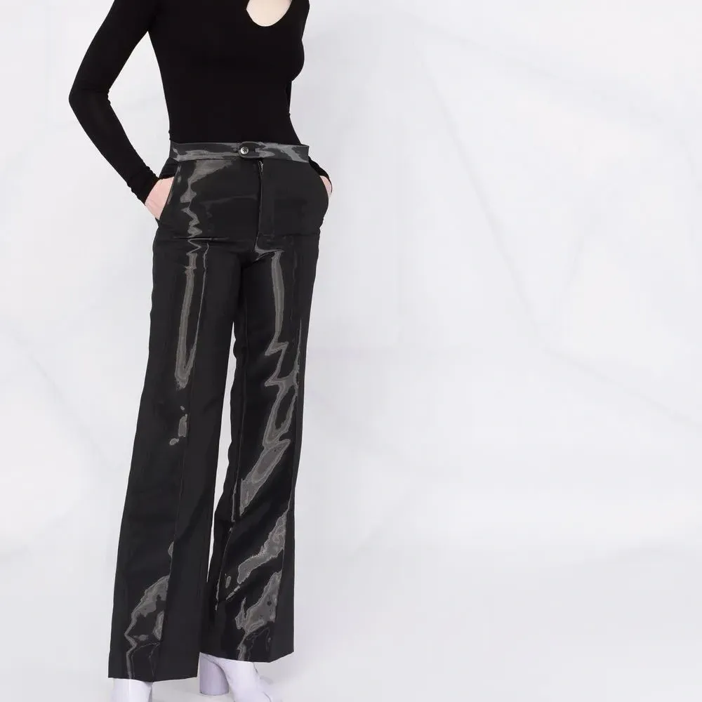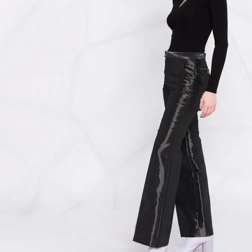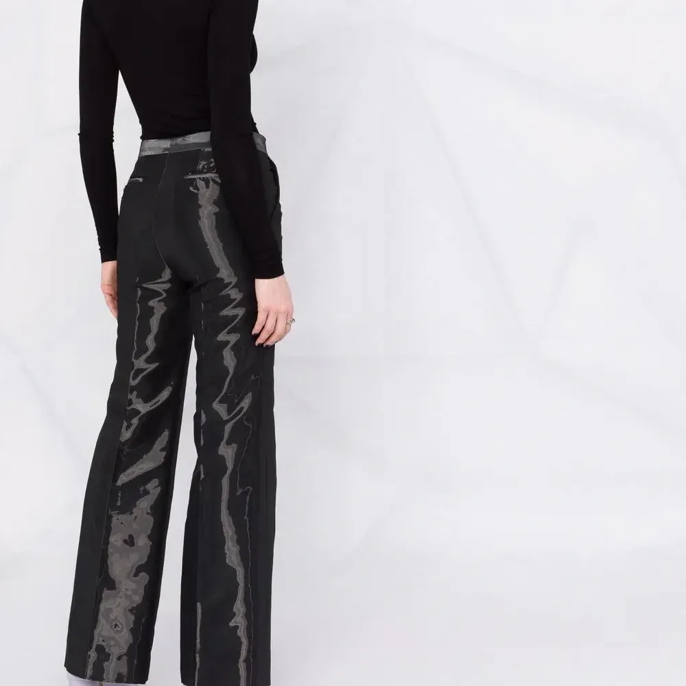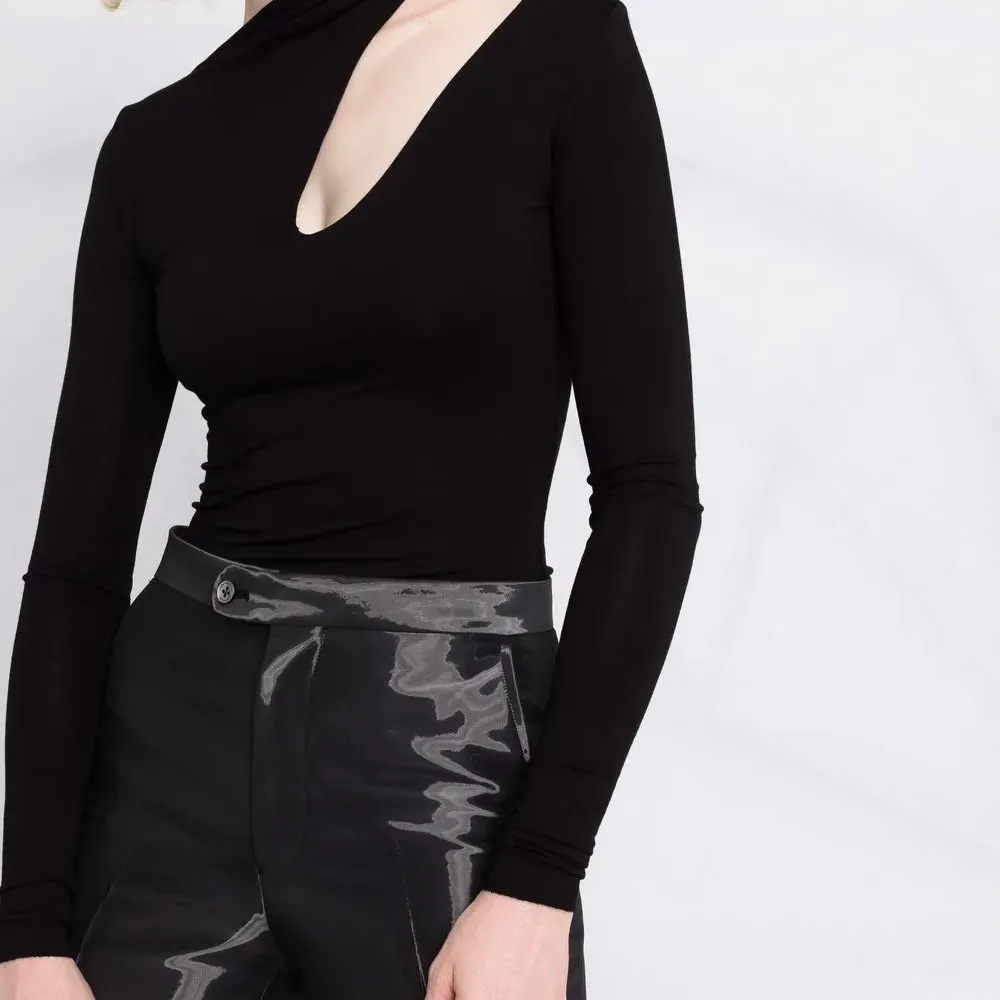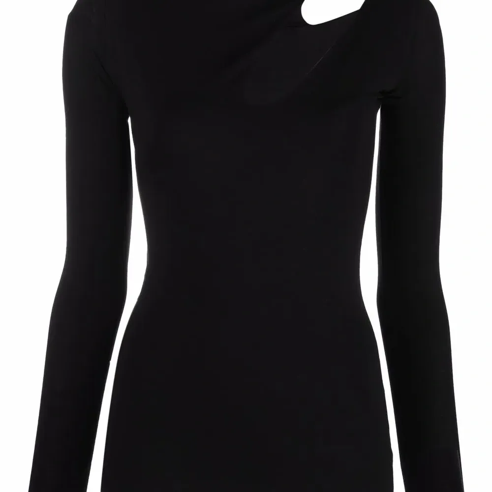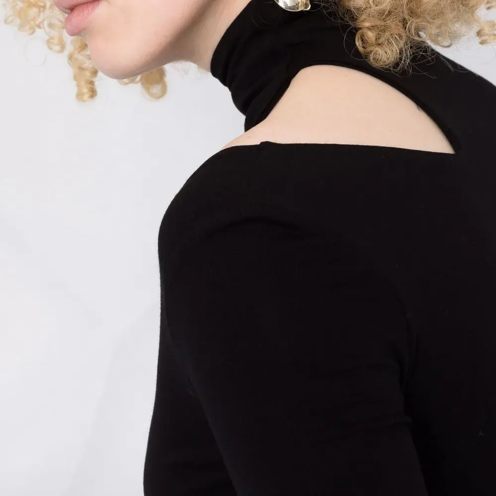 Вырезные детали, высокий воротник, длинные рукава, узкий крой и прямой подол. Цвет: черный.
