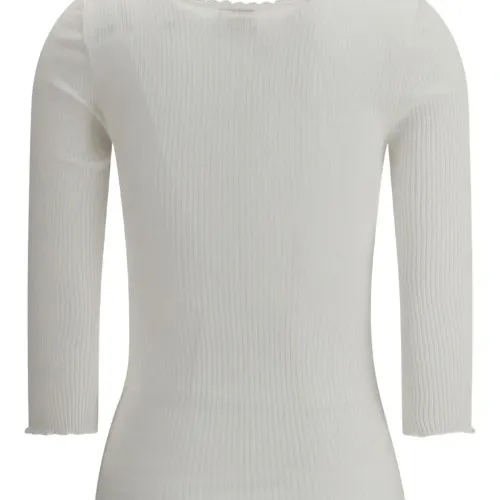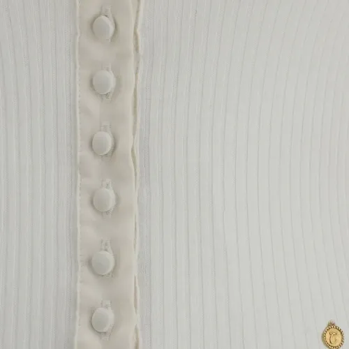 белый в рубчик трикотаж, шелковистая отделка по краю, круглый вырез, застежка на пуговицы спереди, рукава три четверти
