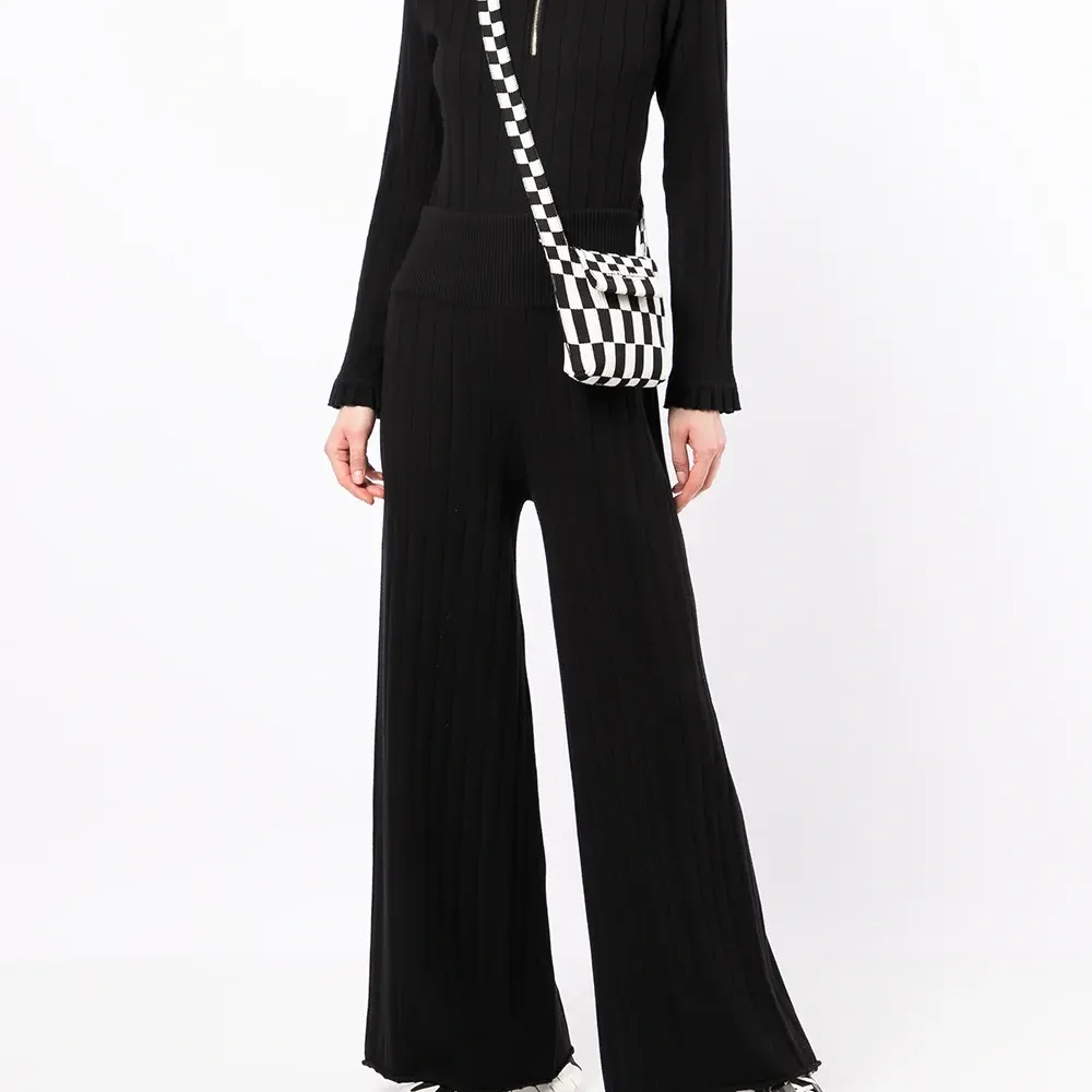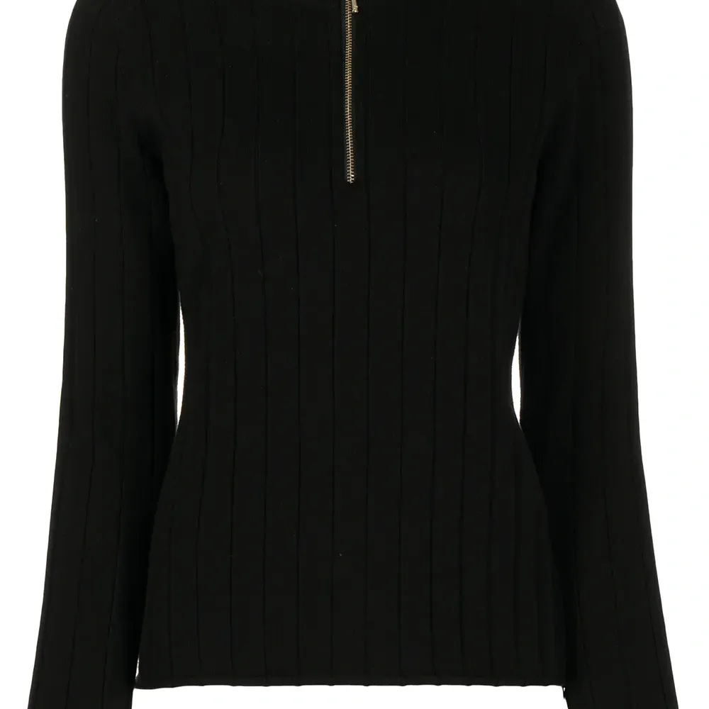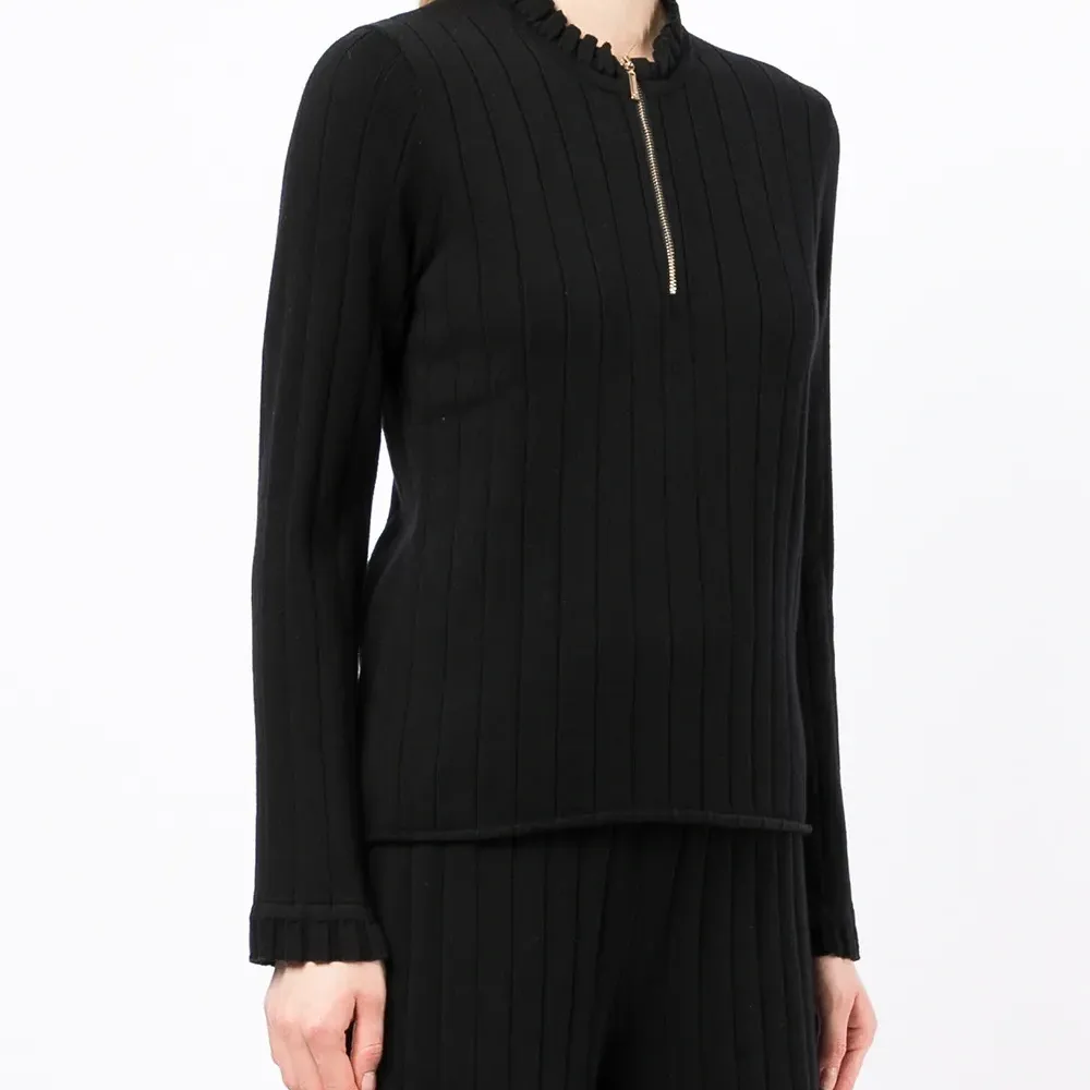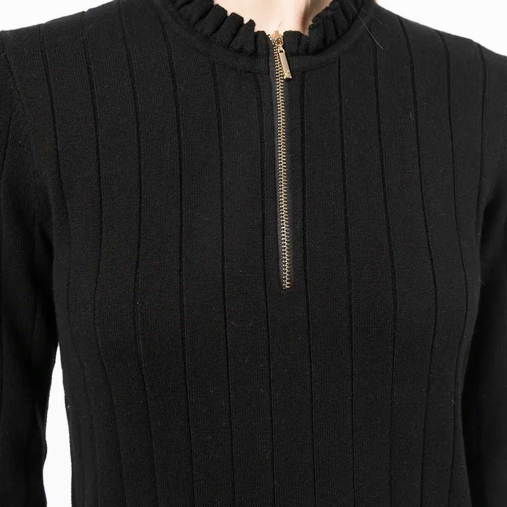 Тонкая вязка, трикотаж в рубчик, детали с оборками, застежка на молнии спереди, длинные рукава и прямой подол. Цвет: черный. .