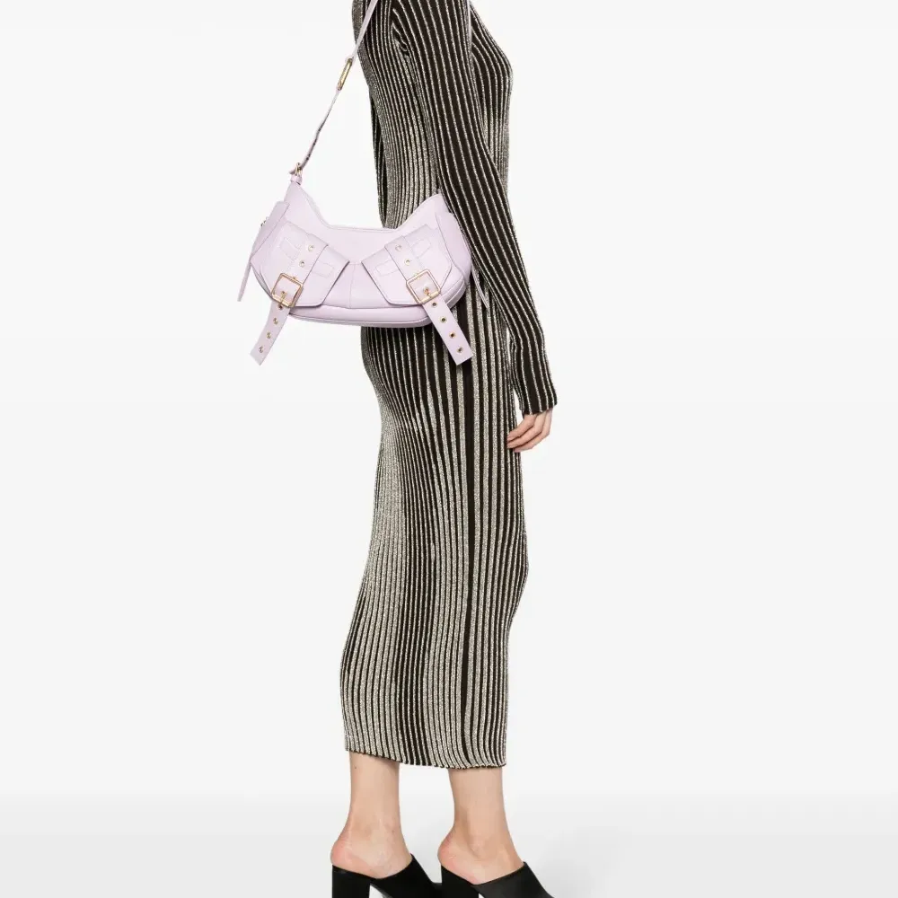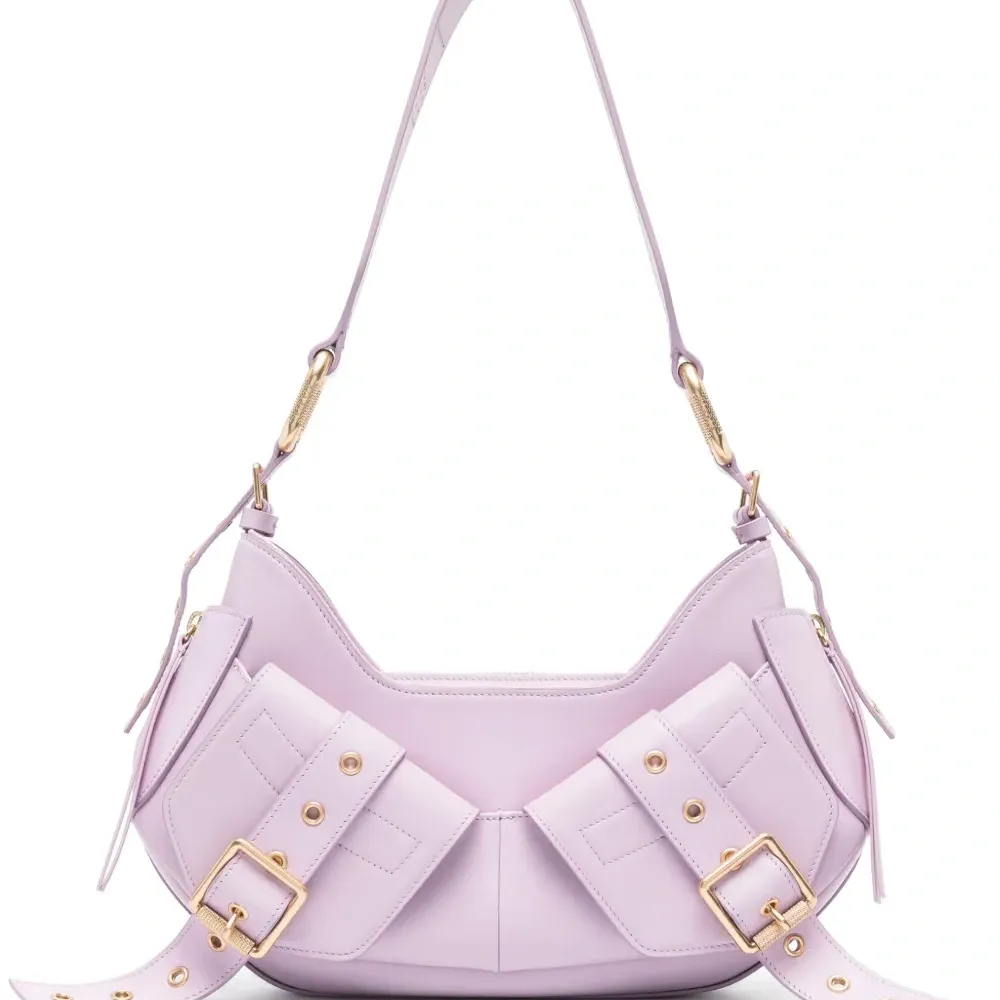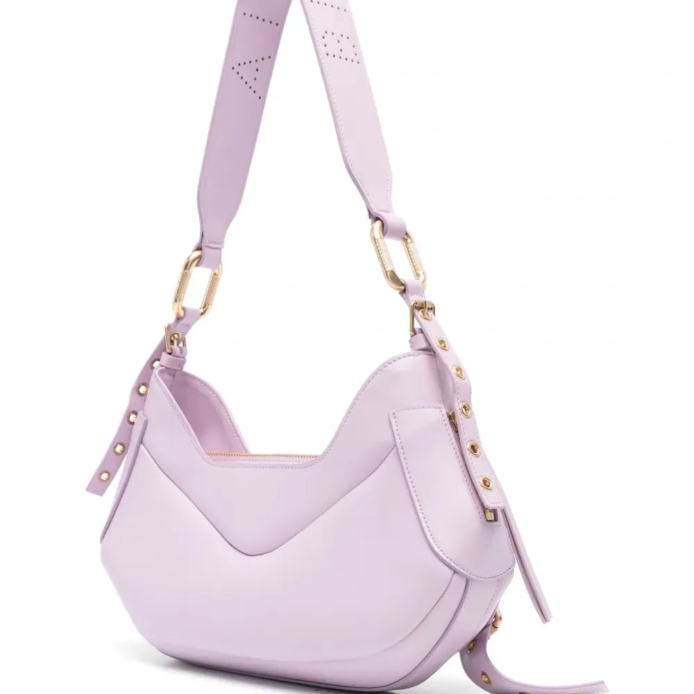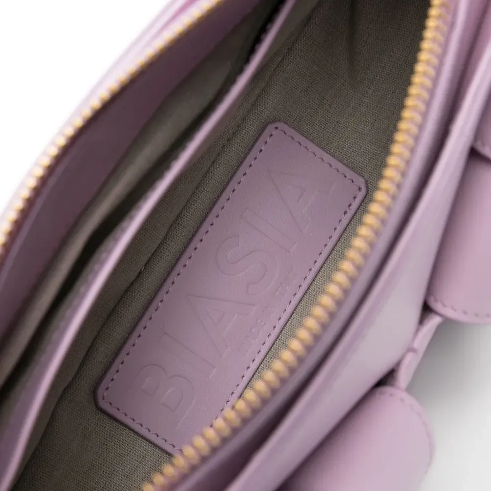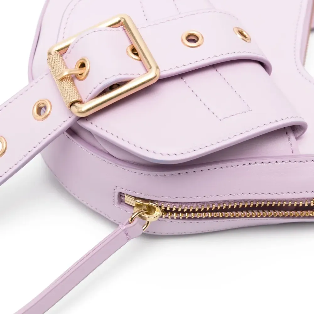 Лиловый, кожа, перфорированный логотип, нашивка с логотипом внутри, люверсы, металлические кольца, деталь с молнией, застежка на молнии сверху, два ремешка с застежкой на пряжке, два передних кармана с клапанами, основное отделение и подкладка из хлопка.