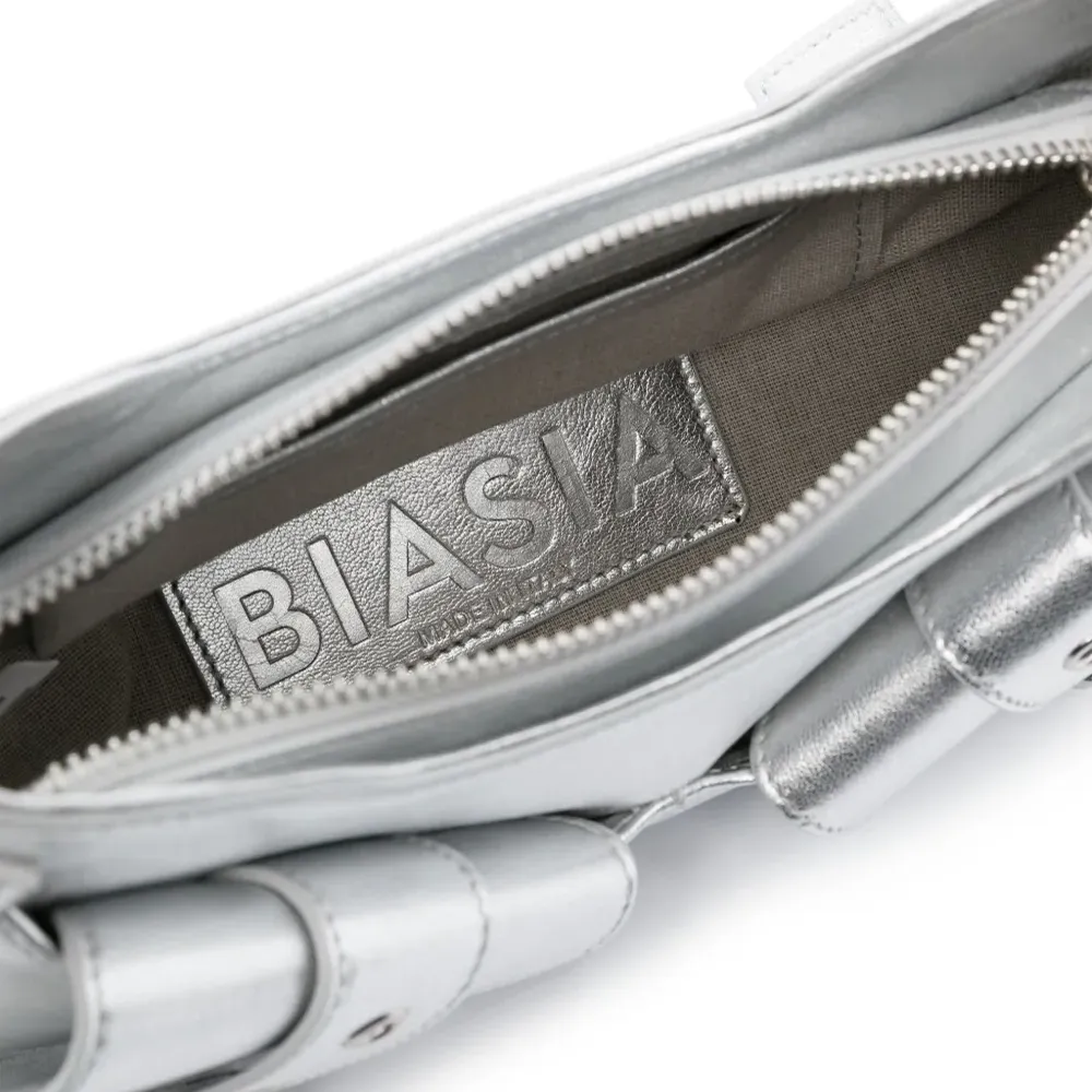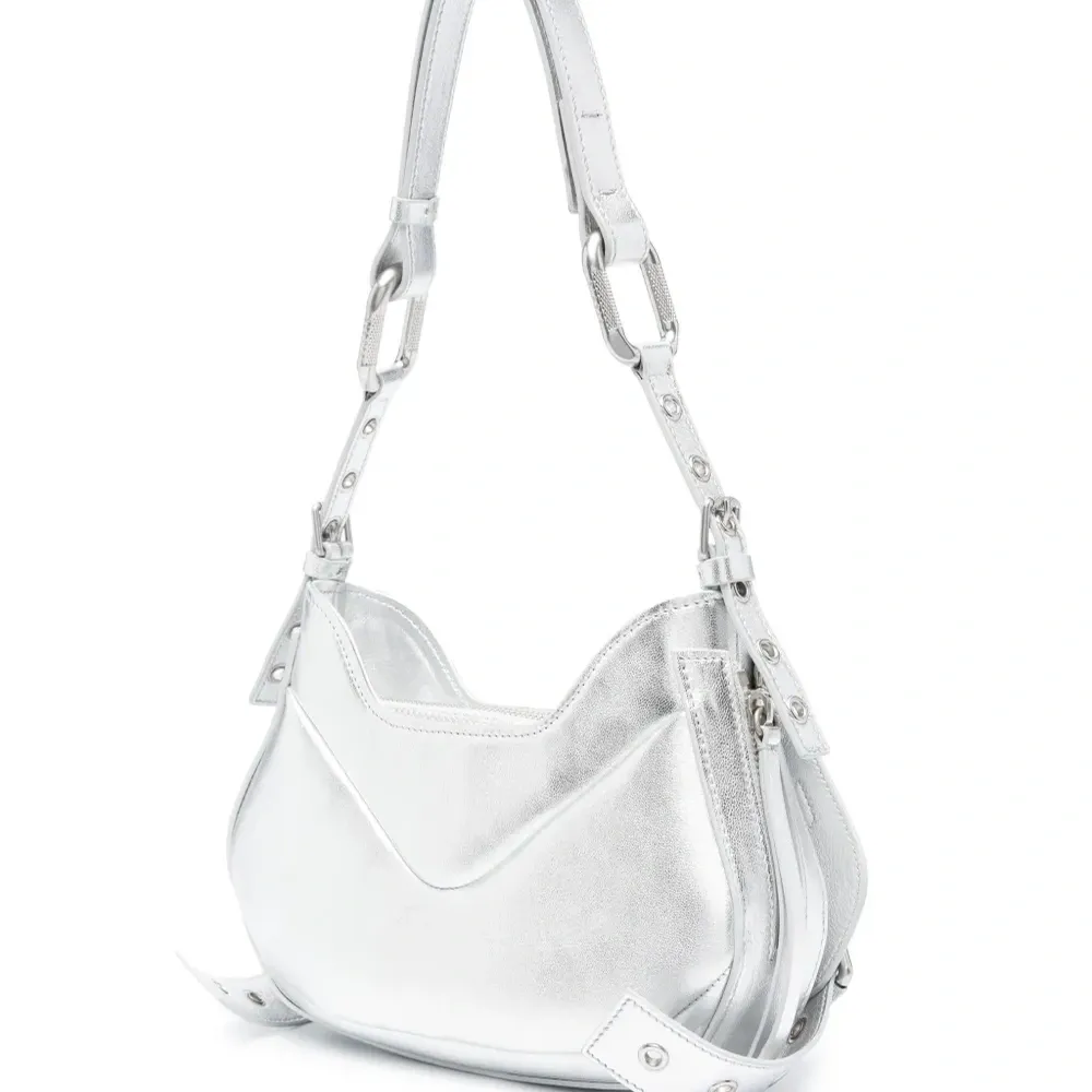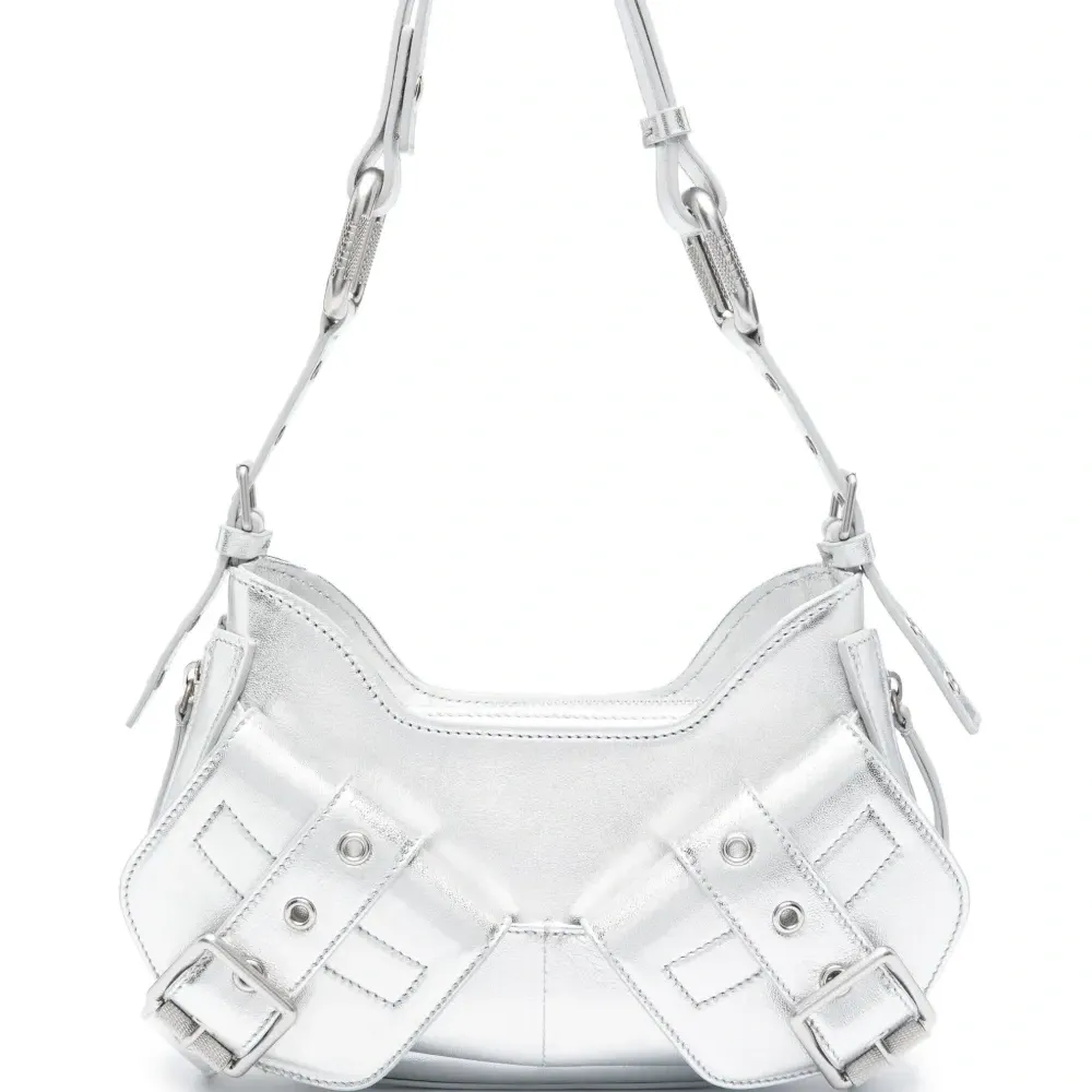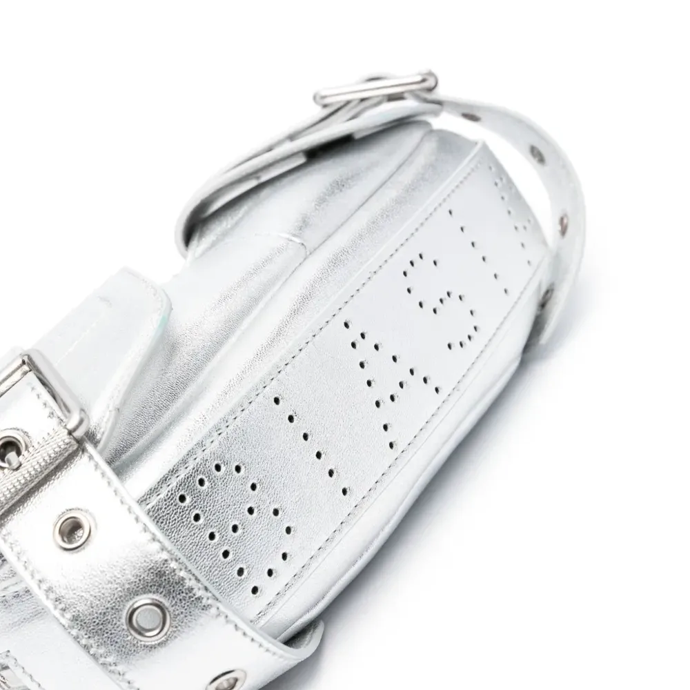 Серебристый, хлопок/кожа, эффект металлик, нашивка с логотипом внутри, серебристая фурнитура, перфорация, застежка на молнии сверху, застежка на пряжке, регулируемый ремень на плечо, основное отделение и два передних кармана с клапанами.