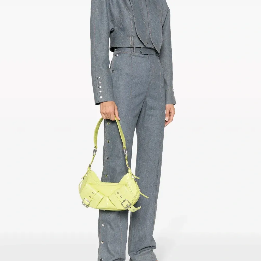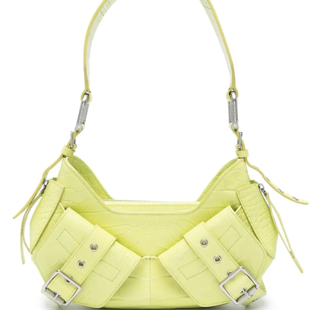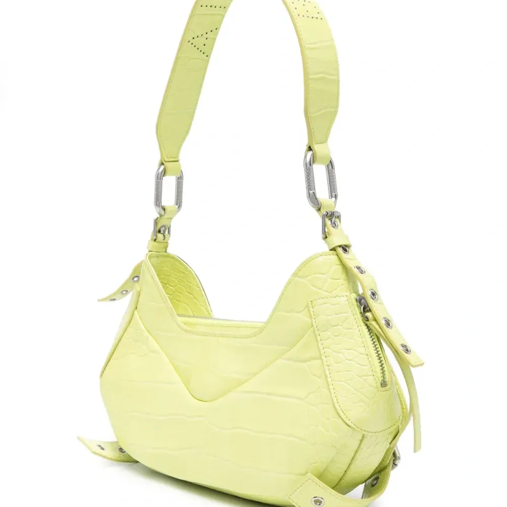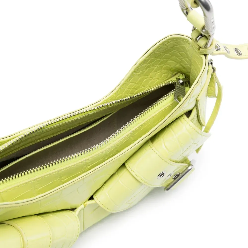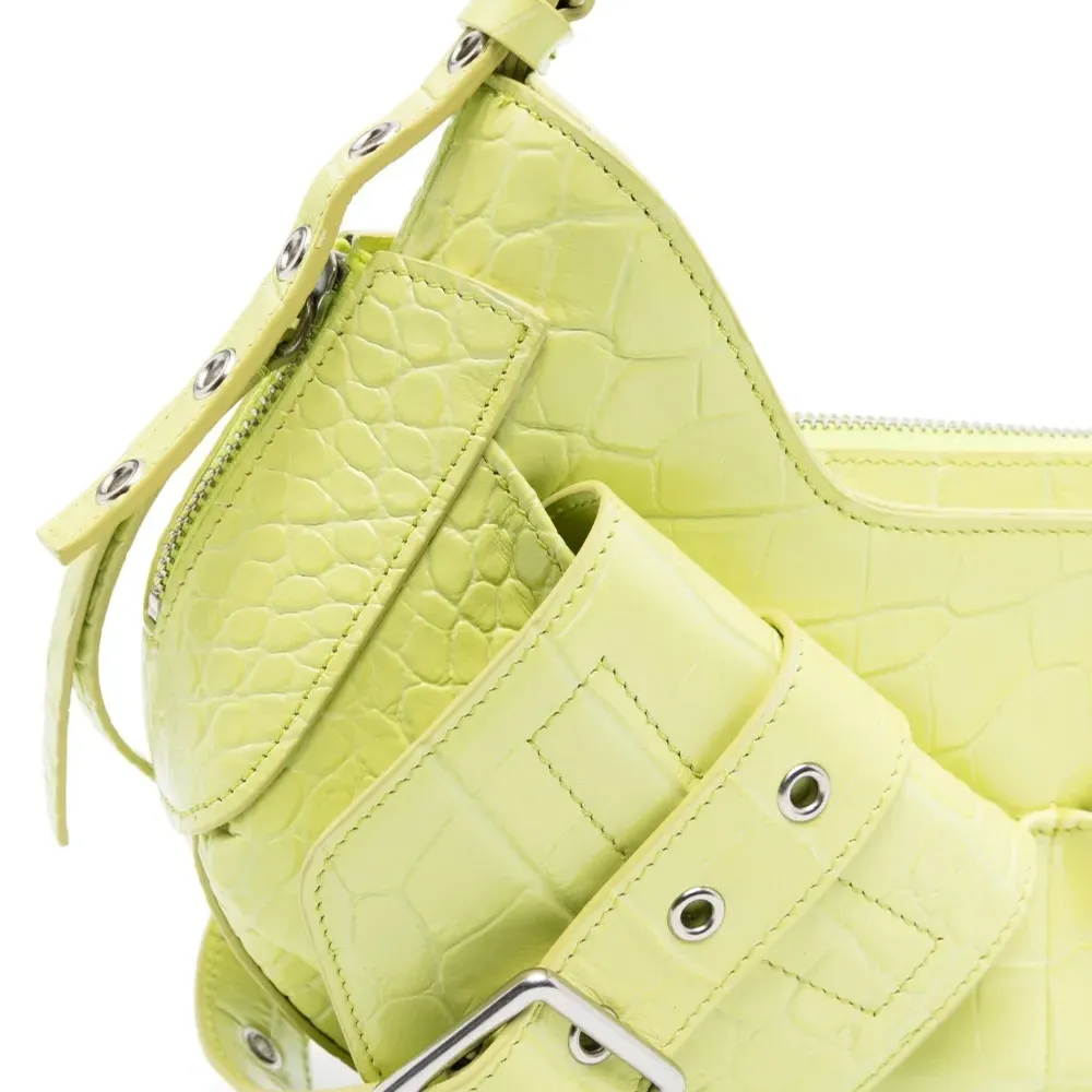 Неоново-зеленый, хлопок/кожа, нашивка с логотипом внутри, серебристая фурнитура, перфорация, застежка на молнии сверху, застежка на пряжке, регулируемый ремень на плечо, два передних кармана с клапанами и основное отделение.