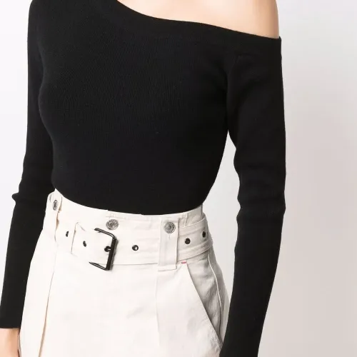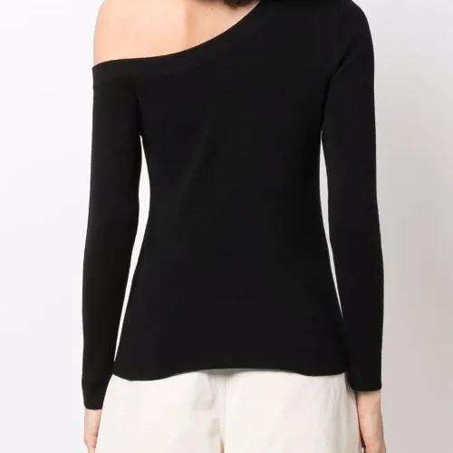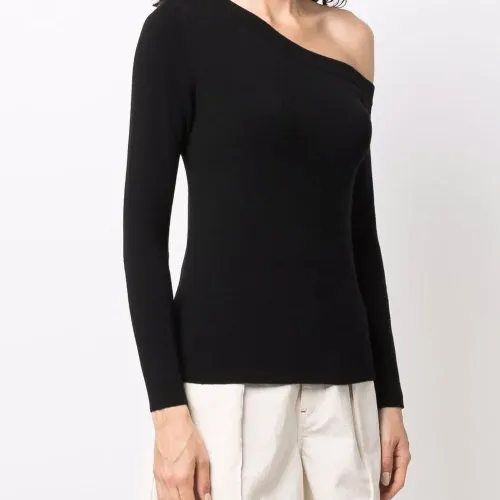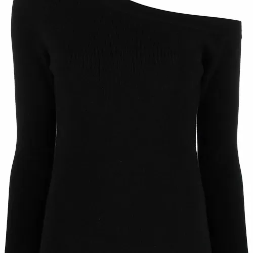 Тонкая вязка, открытые плечи, длинные рукава и прямой подол.