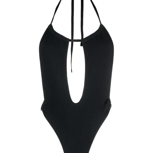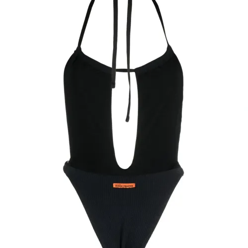 Черный, эластичный материал, нашивка с логотипом сзади, вырезные детали и завязки вокруг шеи. Пожалуйста, примеряйте купальники и пляжные шорты только поверх собственного белья.