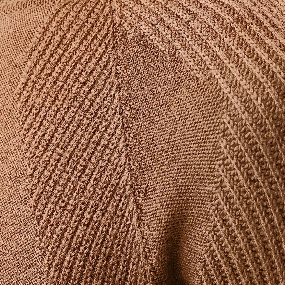 коричневый пуловер с круглым вырезом, длинными рукавами, ребристым низом и прямым подолом