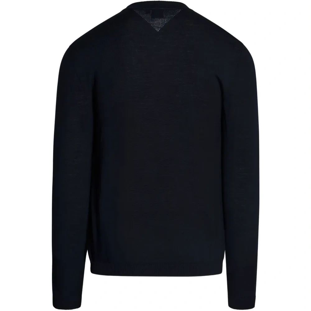 синий свитер с круглым вырезом, тональной строчкой, длинными рукавами и ребристым низом