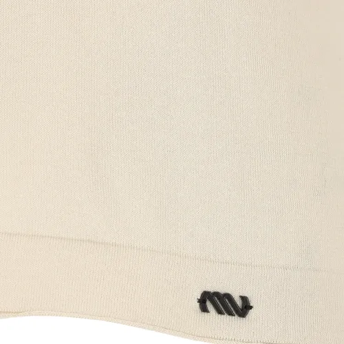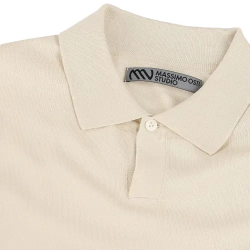 светло-бежевый поло с воротником, короткими рукавами, застежкой на пуговицы, нашивкой с логотипом, ребристым краем