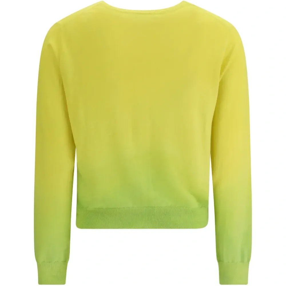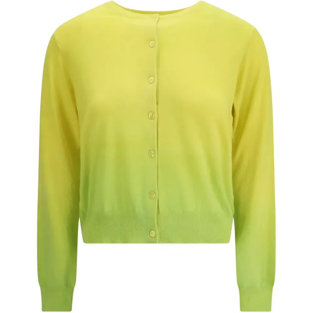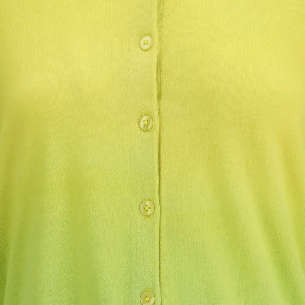 жёлто-зелёный омбре, застёжка на пуговицы, круглый вырез, длинные рукава, ребристый край