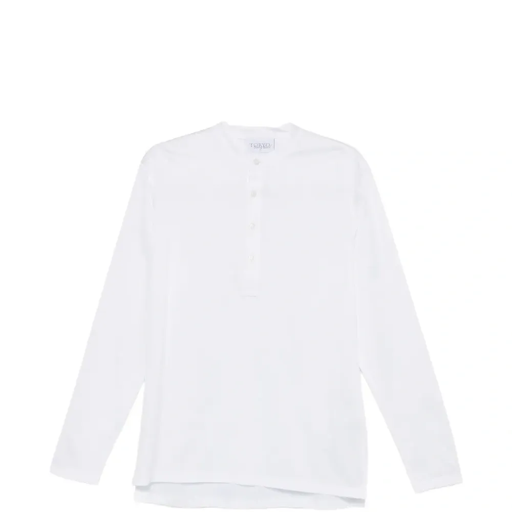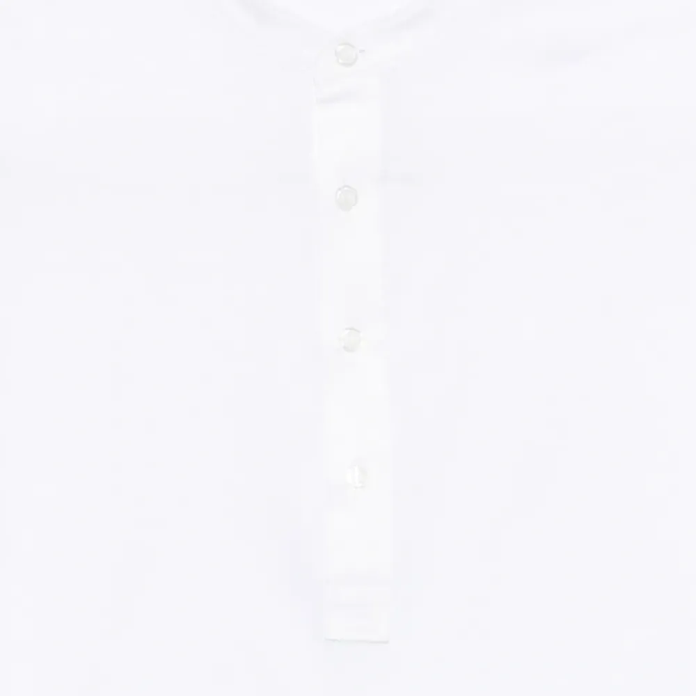 белые длинные рукава, застежка на пуговицы, круглый вырез, планка спереди