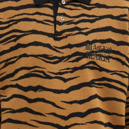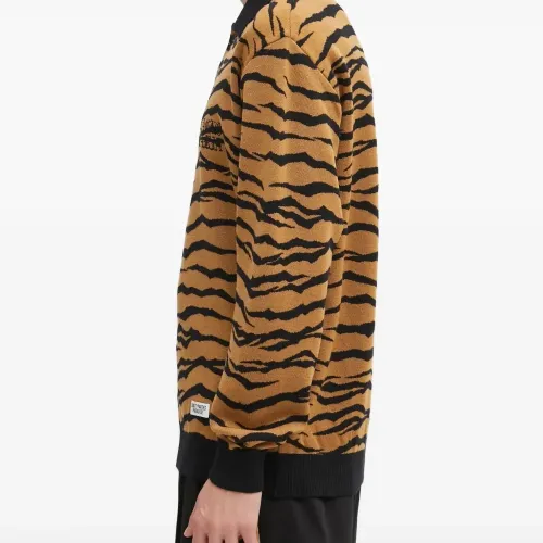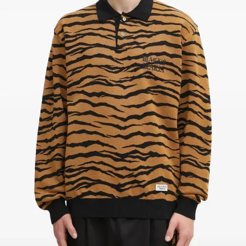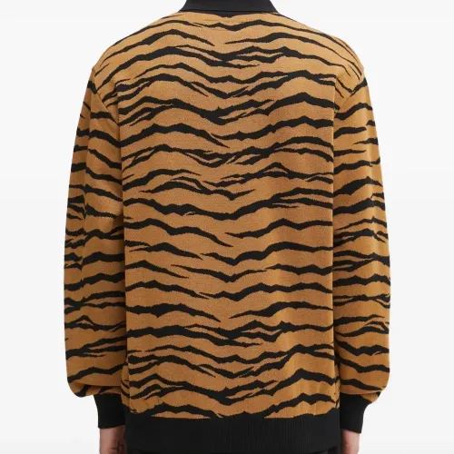 коричневая рубашка с тигровым принтом, воротником, длинными рукавами, ребристым подолом и логотипом на груди