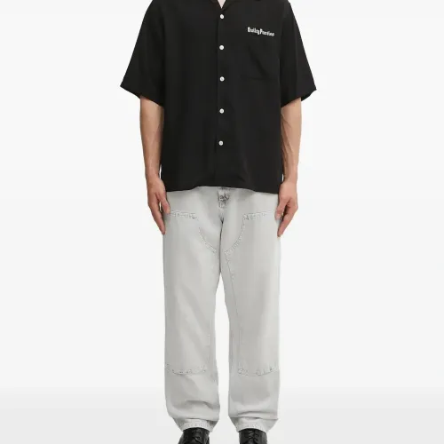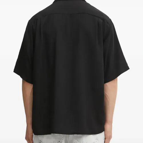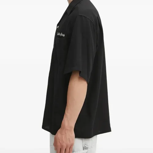 чёрная рубашка с нагрудным карманом, застёжкой на пуговицы, вышитым слоганом, короткими рукавами и отложным воротником
