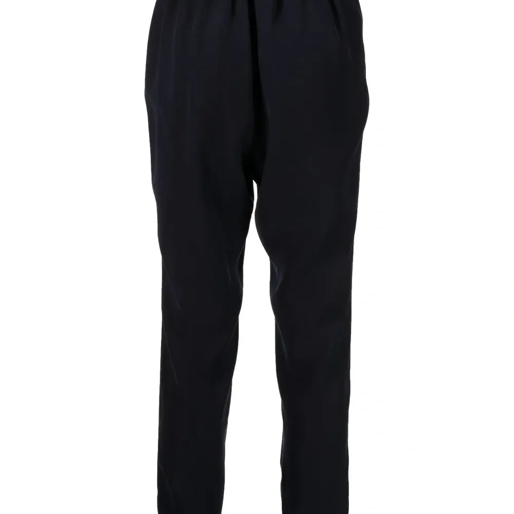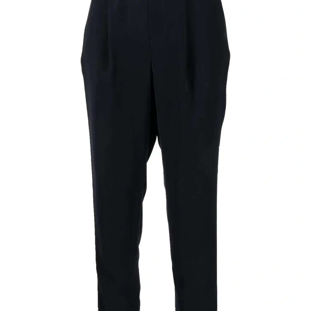 Темно-синий, эластичный пояс, два кармана по бокам и зауженный крой.