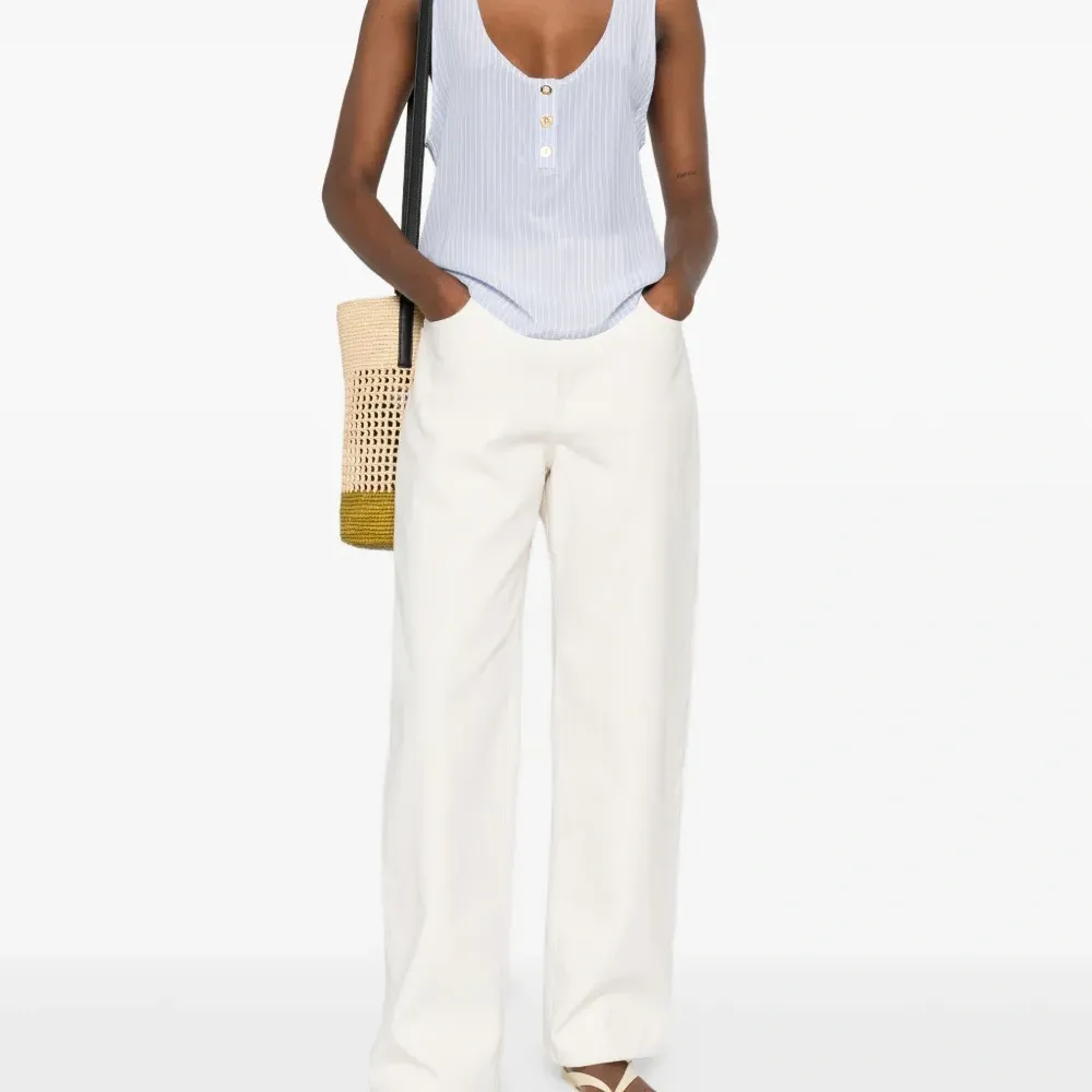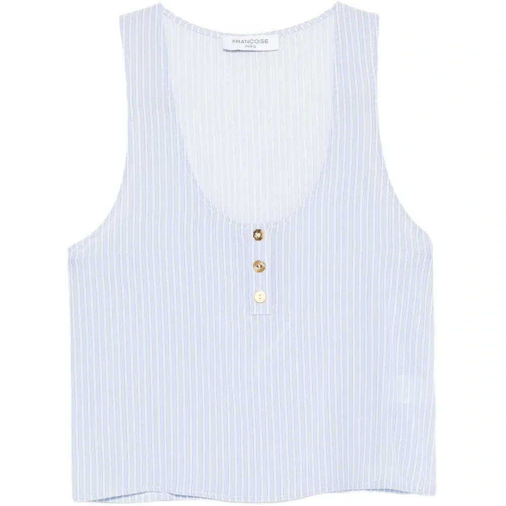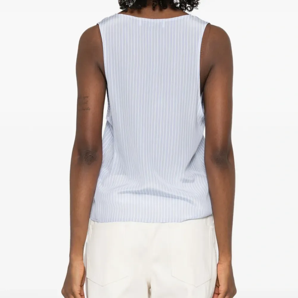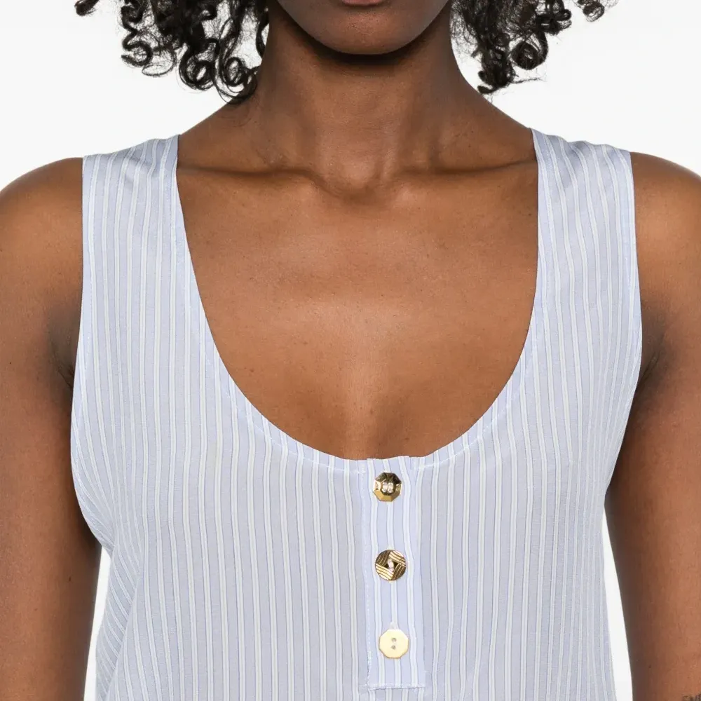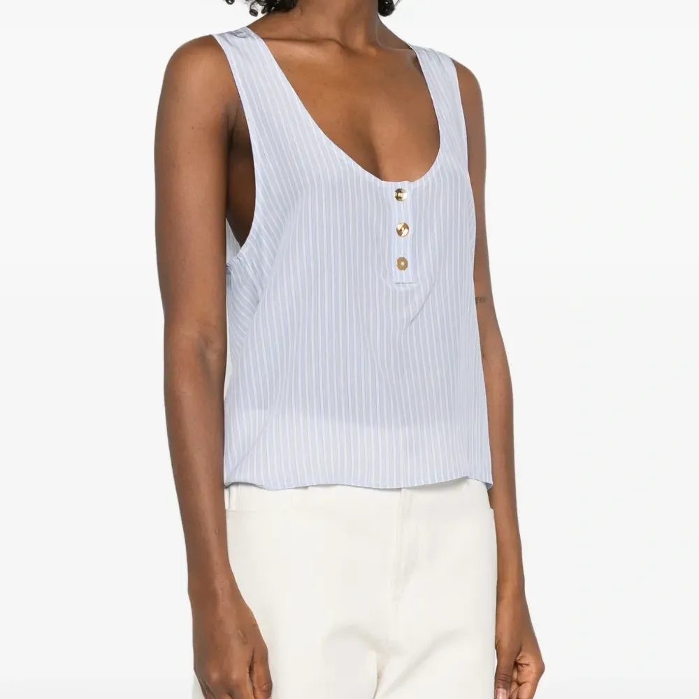 синий/белый шелковый топ в полоску с круглым вырезом, пуговицами и без рукавов