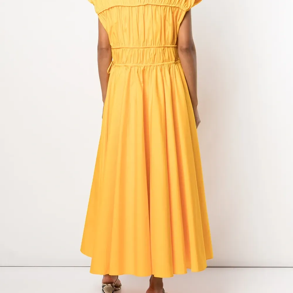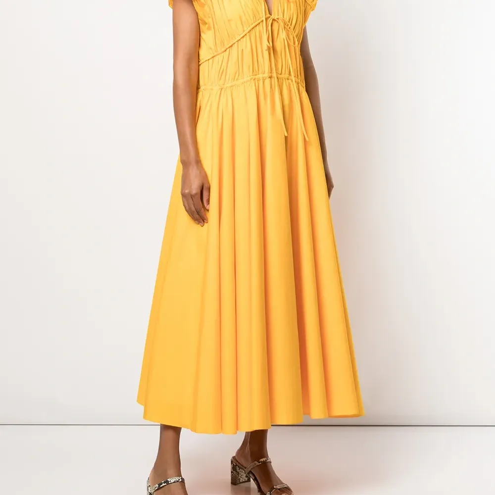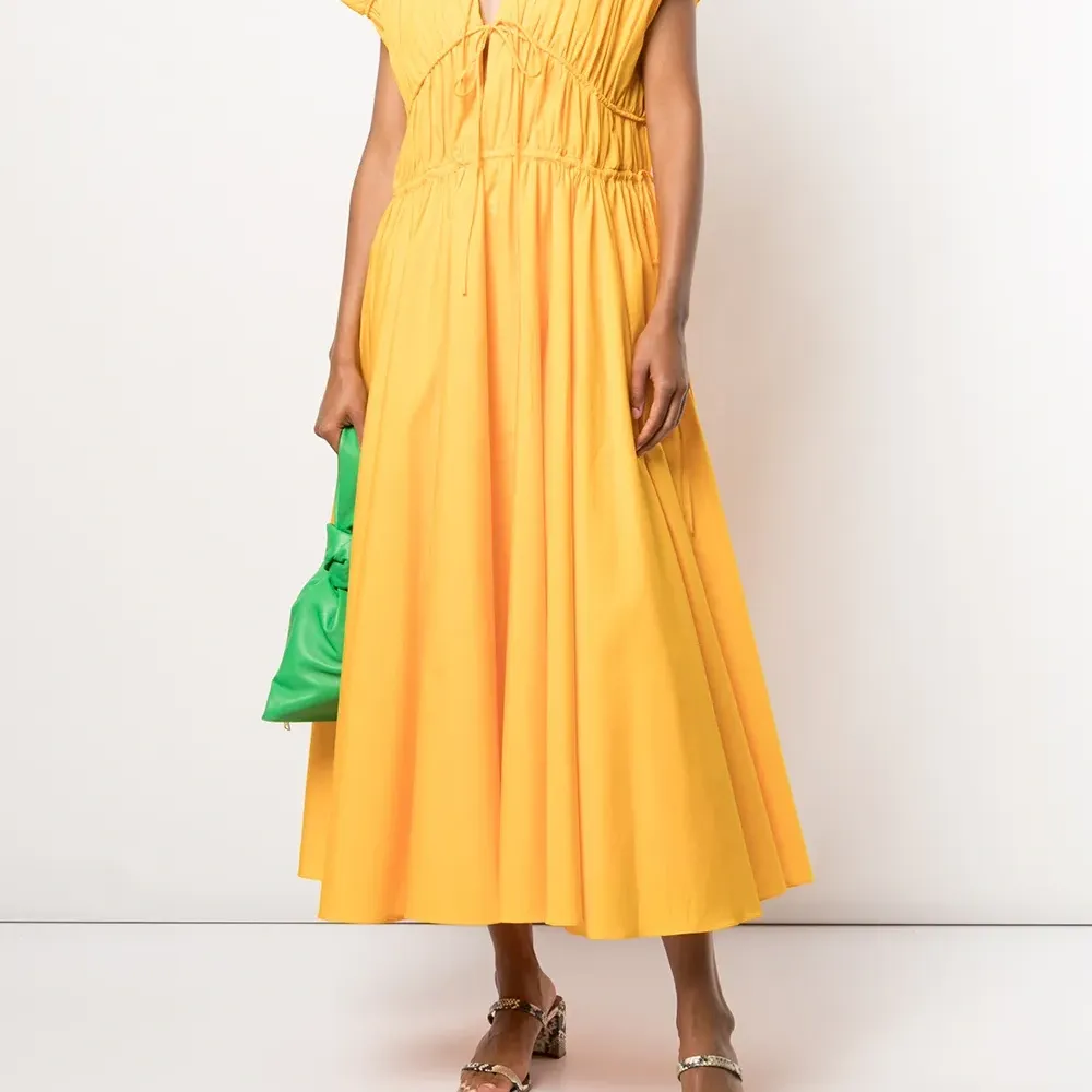 Расклешенный крой, V-образный вырез, завязки спереди, без рукавов и длина миди. Цвет: желтый.