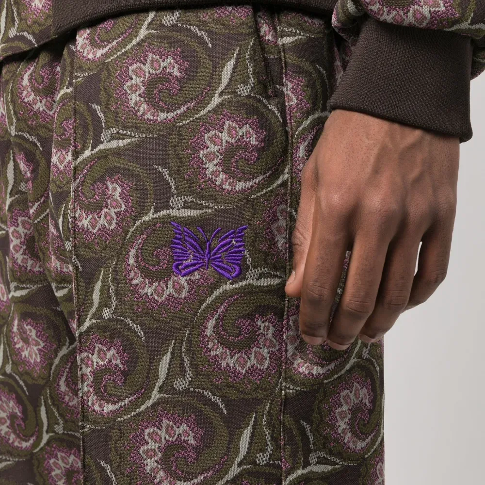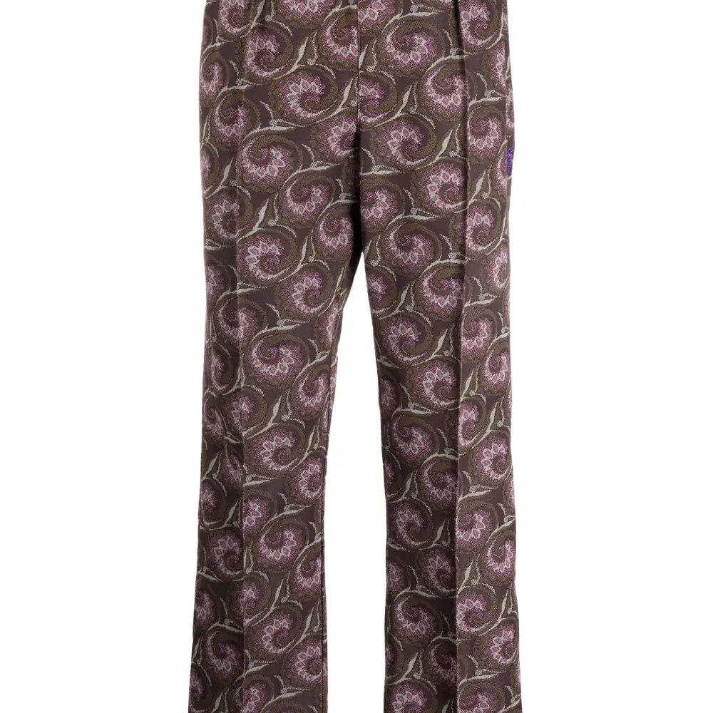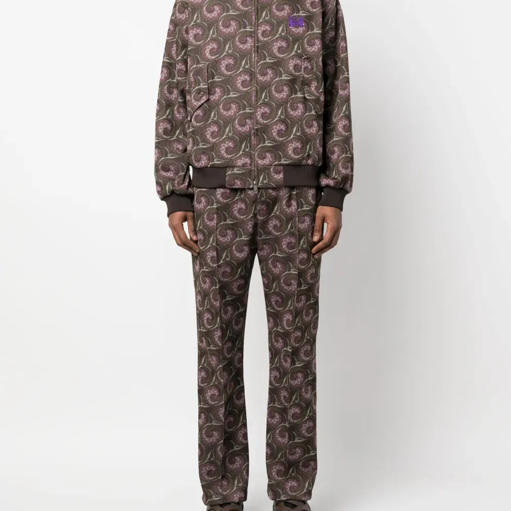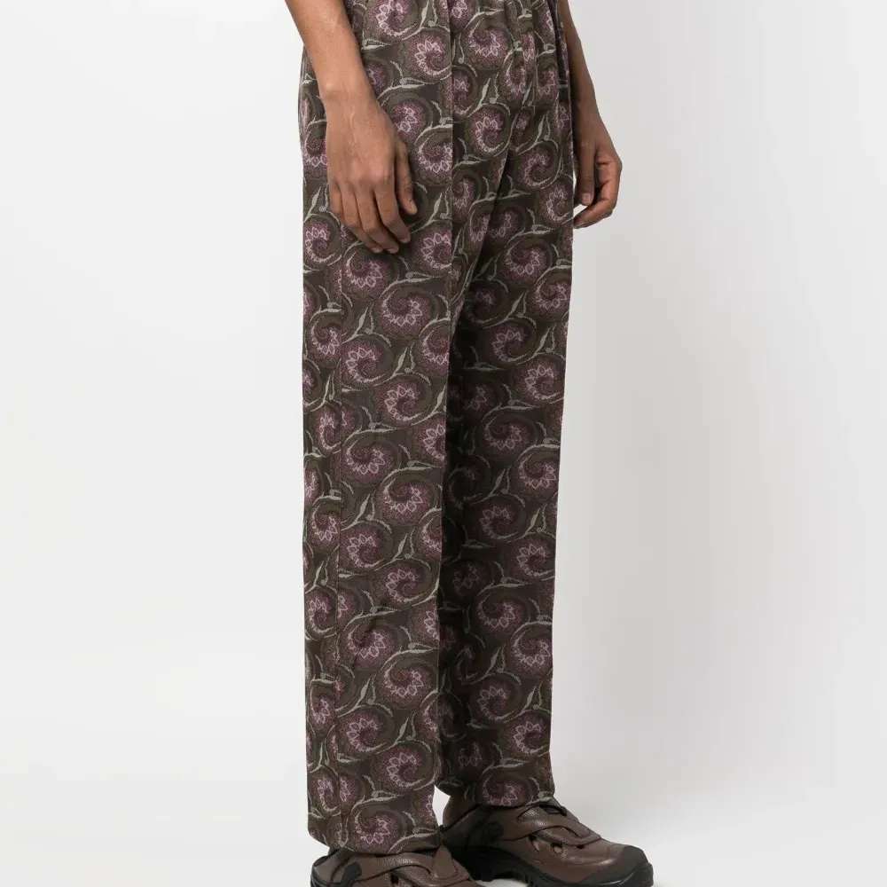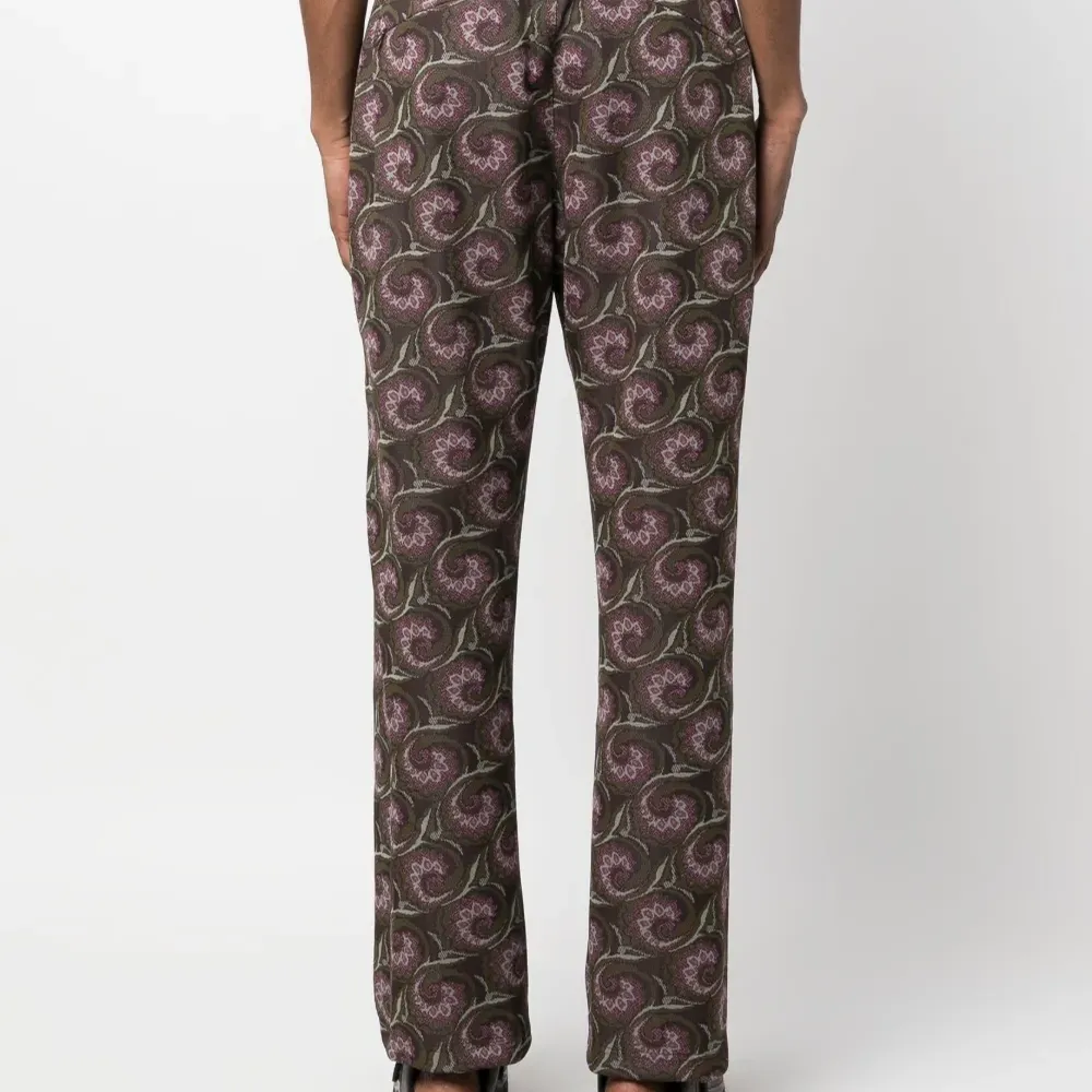 Шоколадный, сплошной графичный принт, вытачки, эластичный пояс, два кармана на молнии по бокам, карман на молнии сзади и прямой крой.