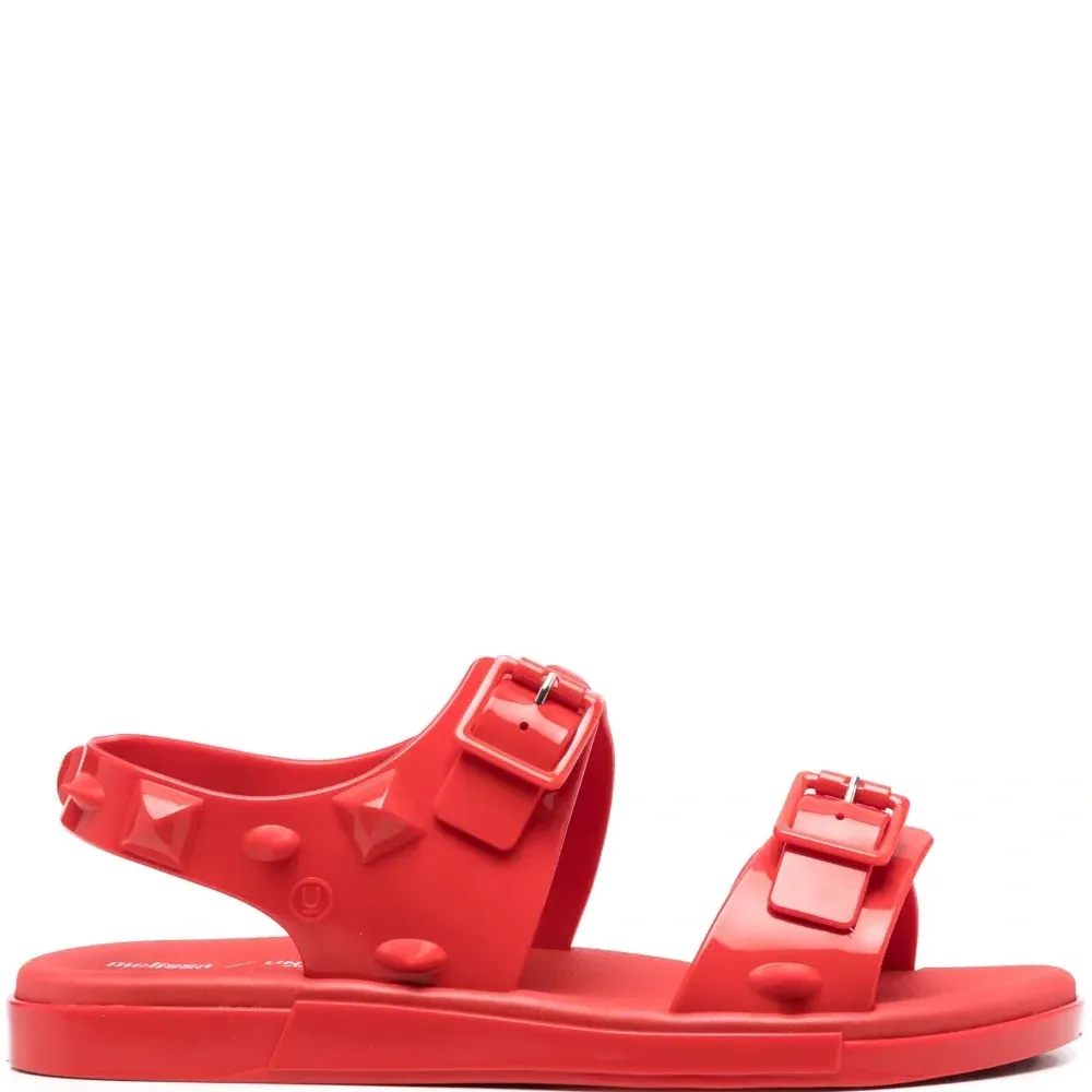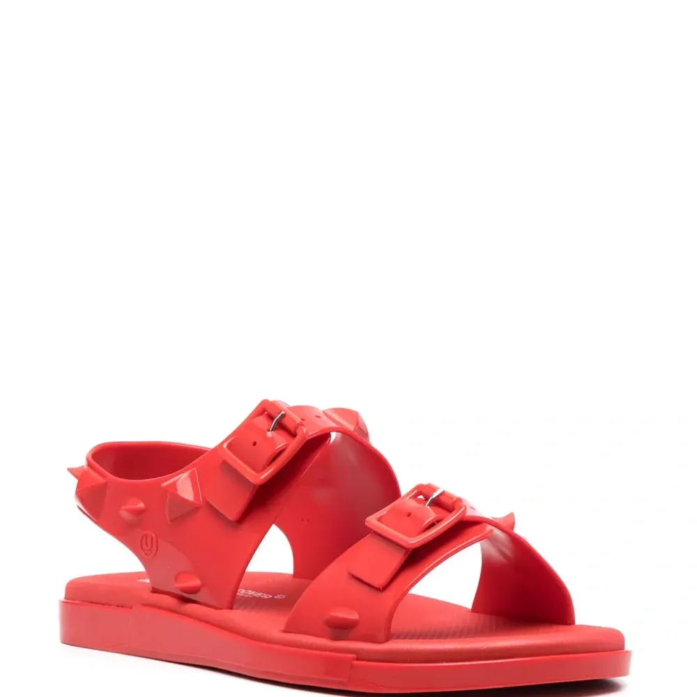 Ярко-красный, глянцевый финиш, заклепки, два ремешка с застежкой на пряжке, открытый носок, стелька с логотипом и плоская резиновая подошва.