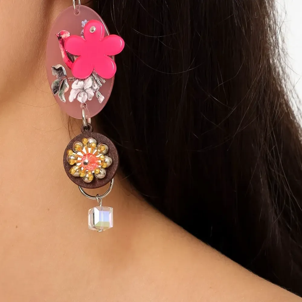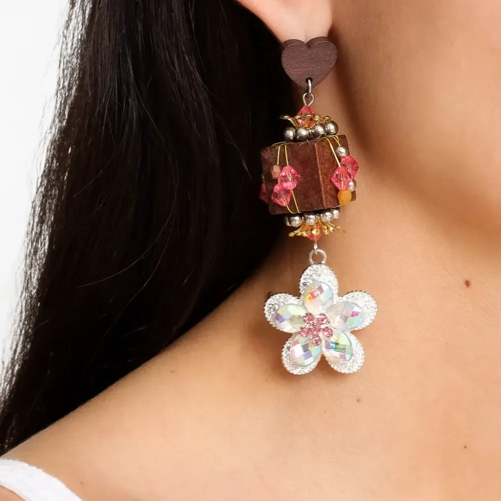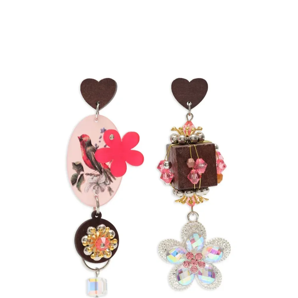 Серебристо-коричневый цвет, детали в виде сердца, детали в виде цветка, украшение камнями, подвесной асимметричный дизайн. Эти серьги идут в паре.