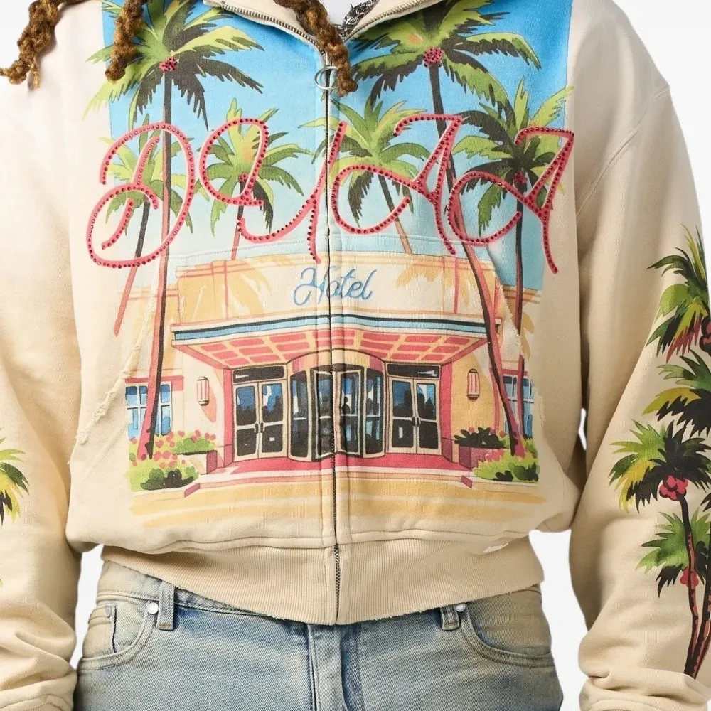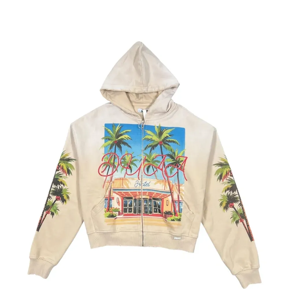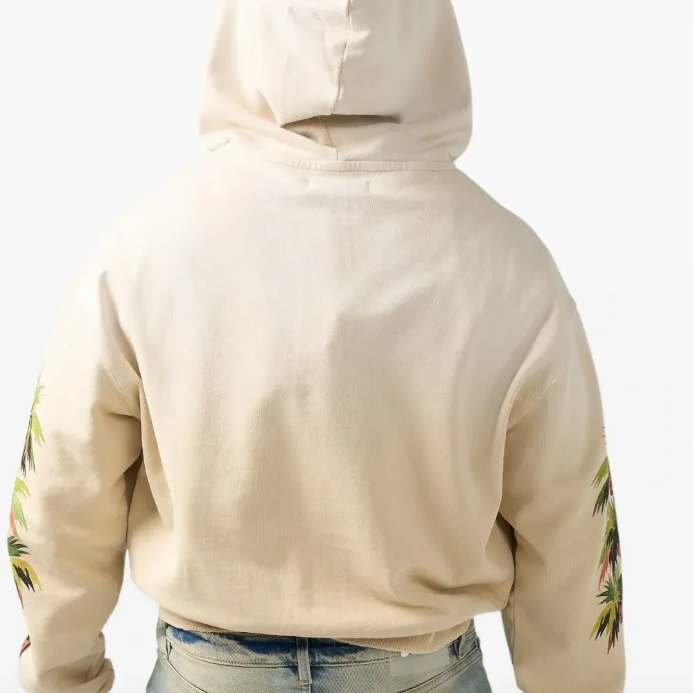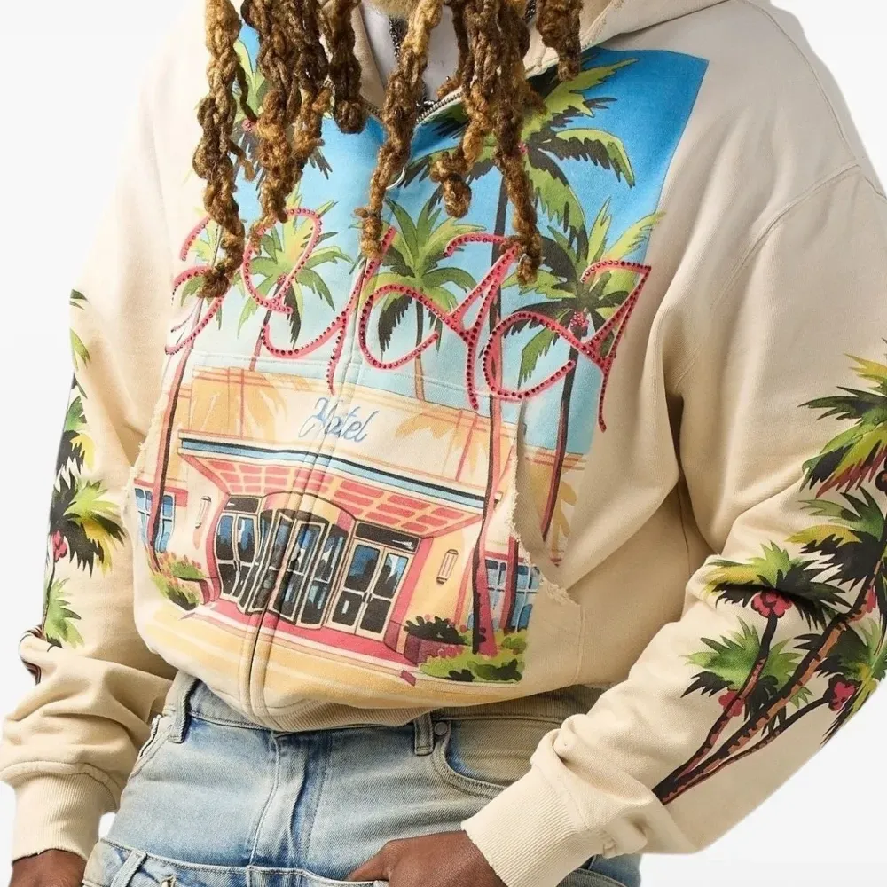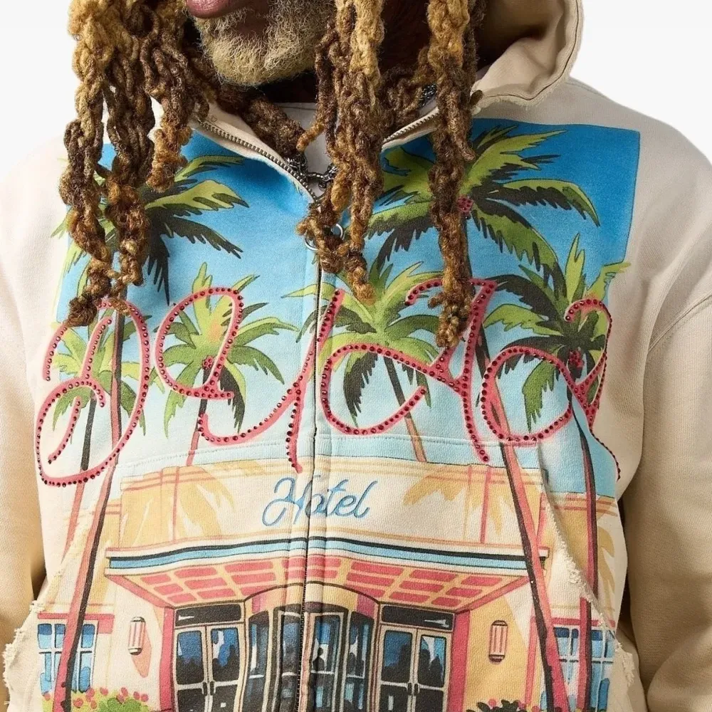 бежевый худи с графичным принтом, кулиской на капюшоне, застёжкой-молнией и длинными рукавами