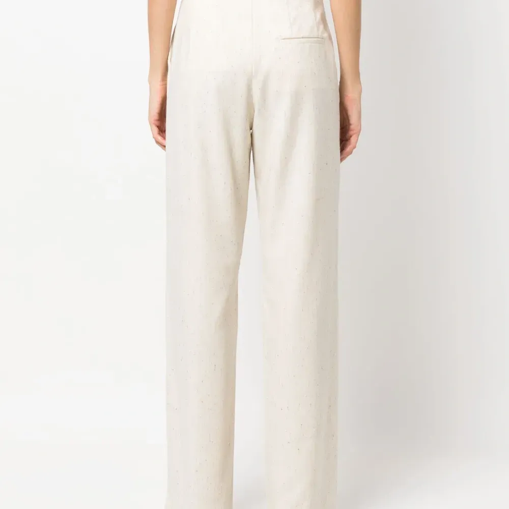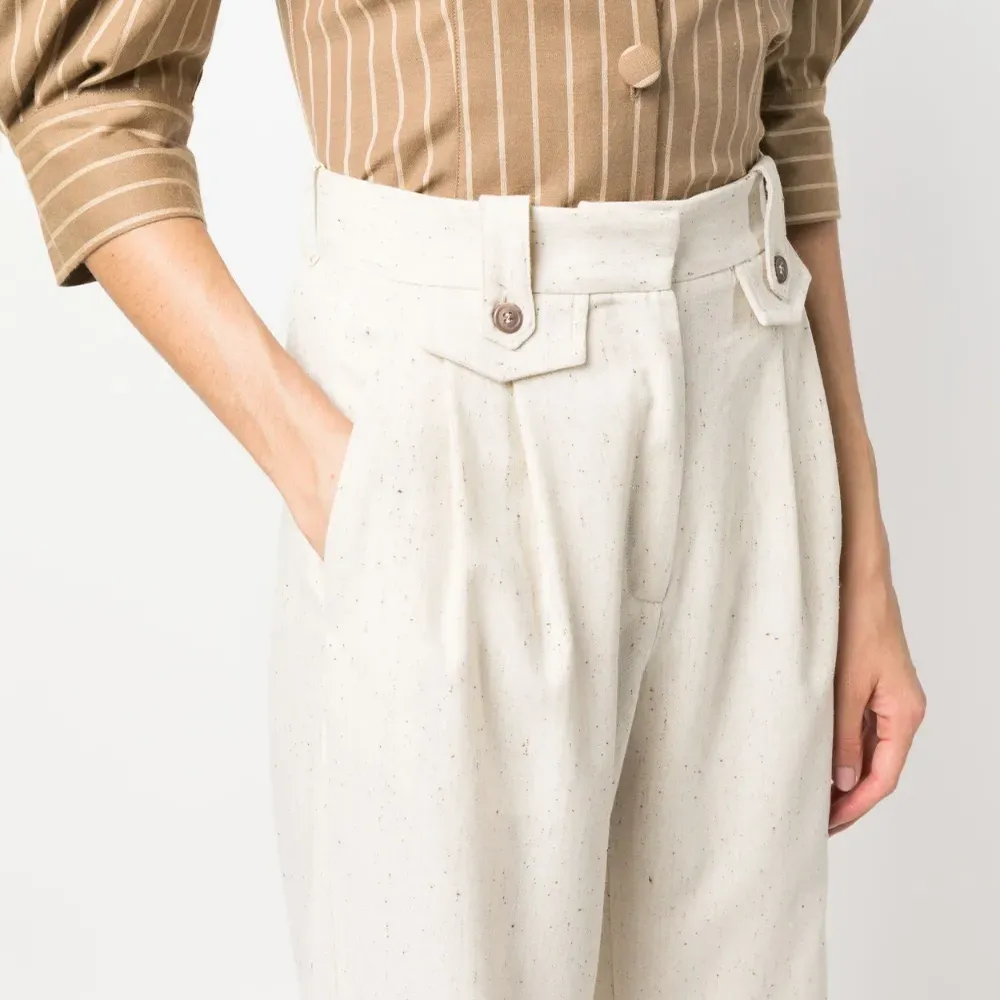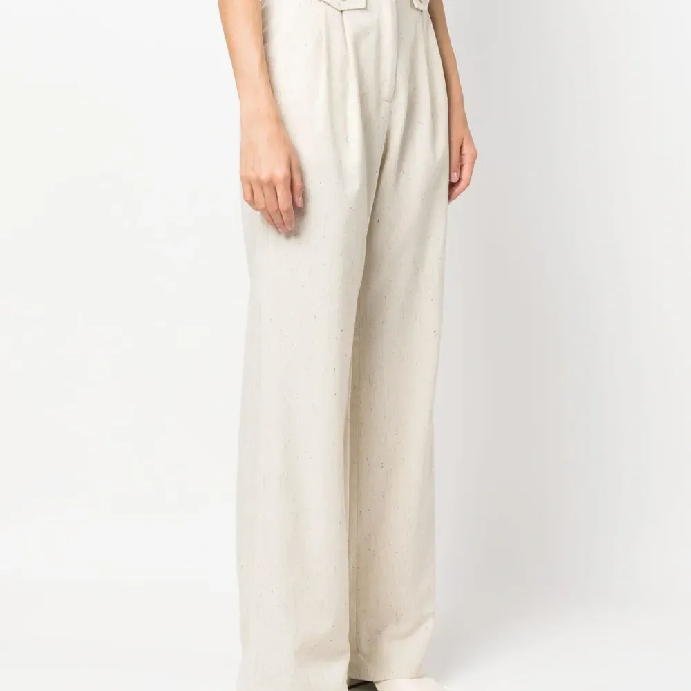 Складки, средняя посадка, петли для ремня, потайная застежка спереди, два вшитых кармана по бокам и задние карманы с листочкой.