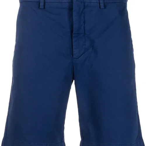 Кобальтово-синий, эластичный хлопок, петли для ремня, застежка на молнии и пуговице спереди, длина по колено, два прорезных кармана по бокам и два кармана с листочкой сзади.