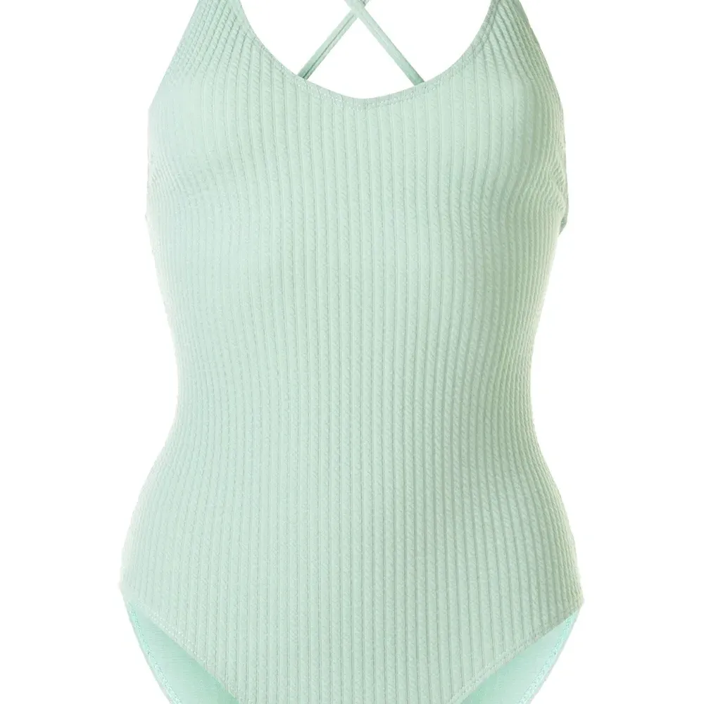 U-образный вырез, перекрестные ремешки и облегающий крой. Пожалуйста, примеряйте купальники и пляжные шорты только поверх собственного белья.