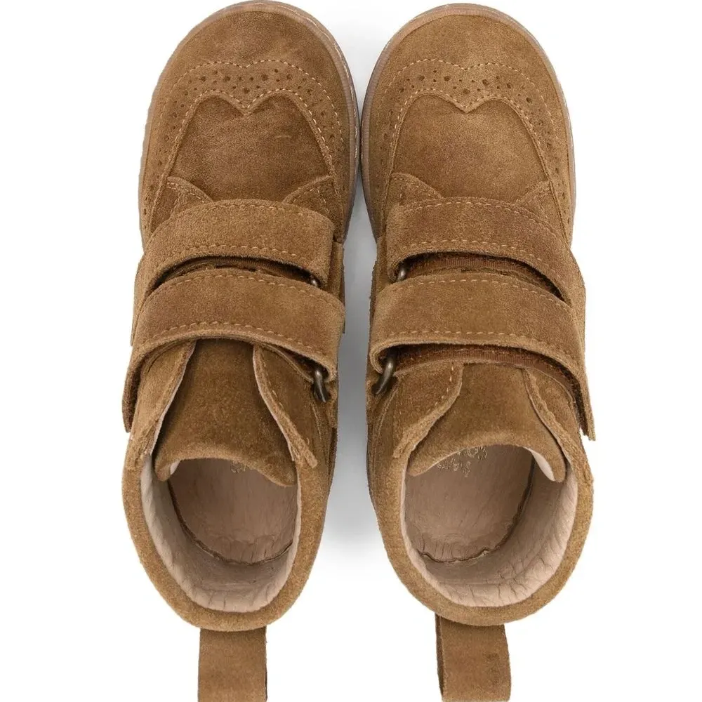 Расцветка Tobacco Brown, замша из телячьей кожи, телячья кожа, перфорация, браслет в два оборота, застежка на липучке спереди, петля для подтягивания сзади, закругленный носок, плоская резиновая подошва и высота по щиколотку.