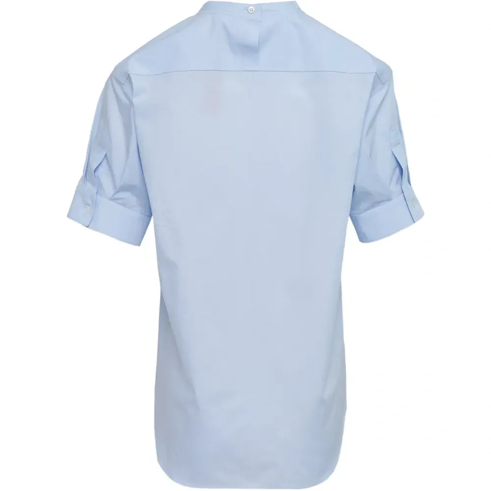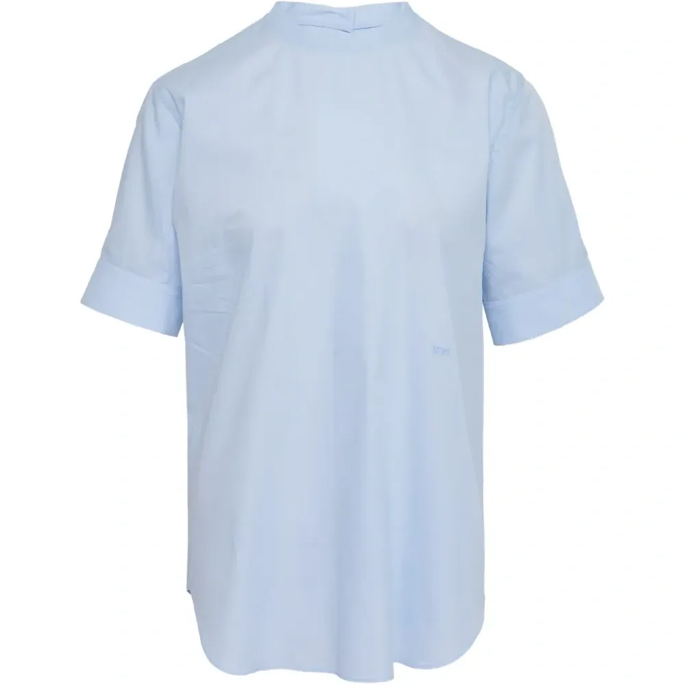 светло-голубая рубашка с короткими рукавами, застёжкой на пуговицы и воротником на застёжке