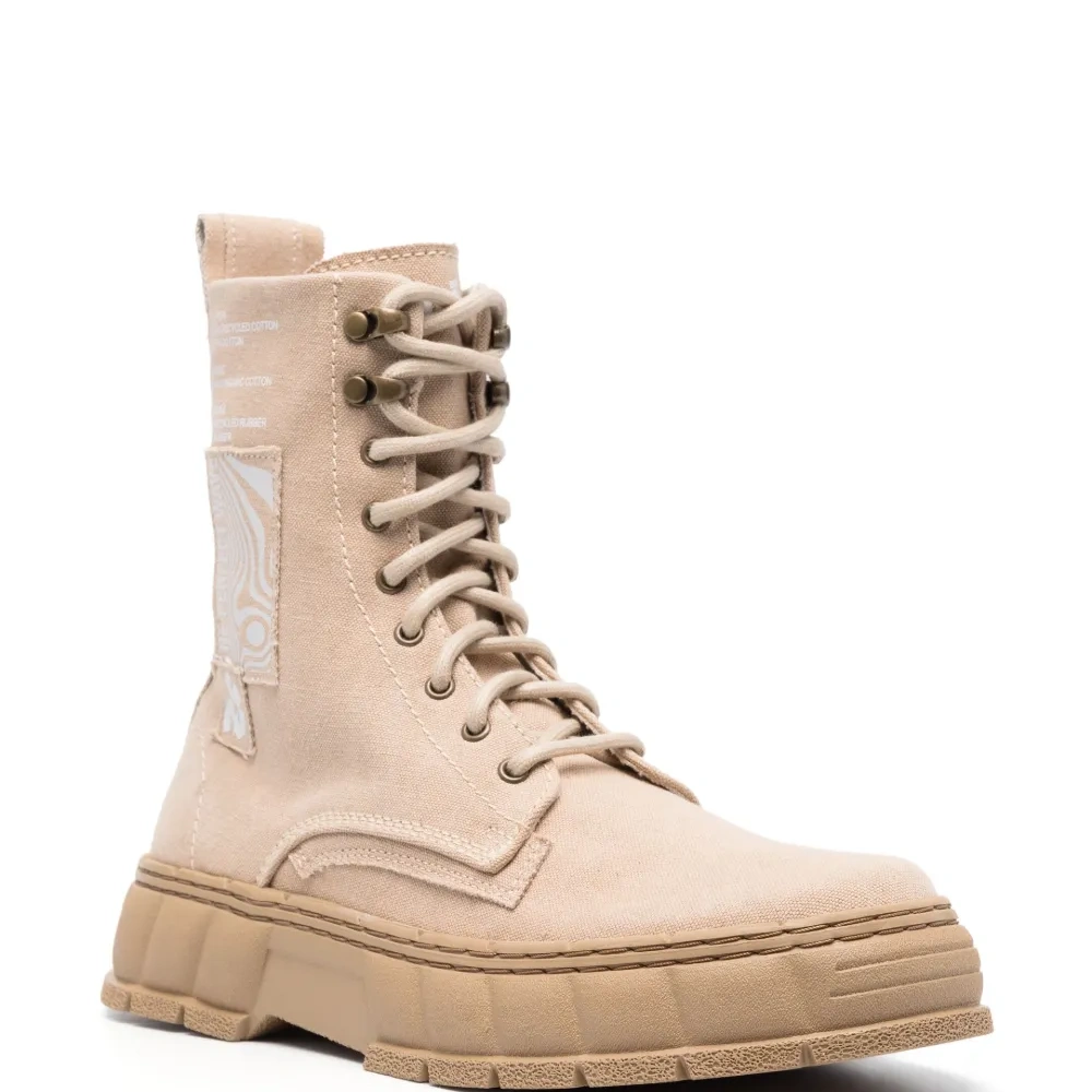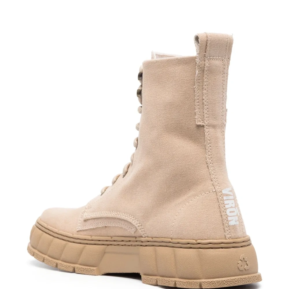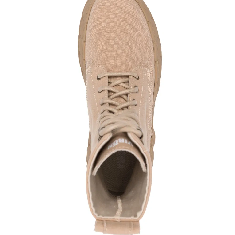 Песочно-бежевый, парусина, переработанная резина, принт с логотипом сзади, закругленный носок, шнуровка спереди, петля для подтягивания сзади и массивная резиновая подошва.