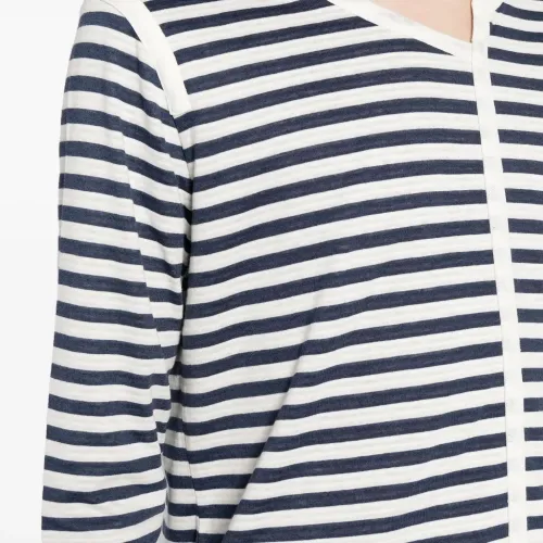Темно-синий, кремово-белый, смесовый хлопок, асимметричная форма, узор в горизонтальную полоску, длинные рукава и асимметричный подол.