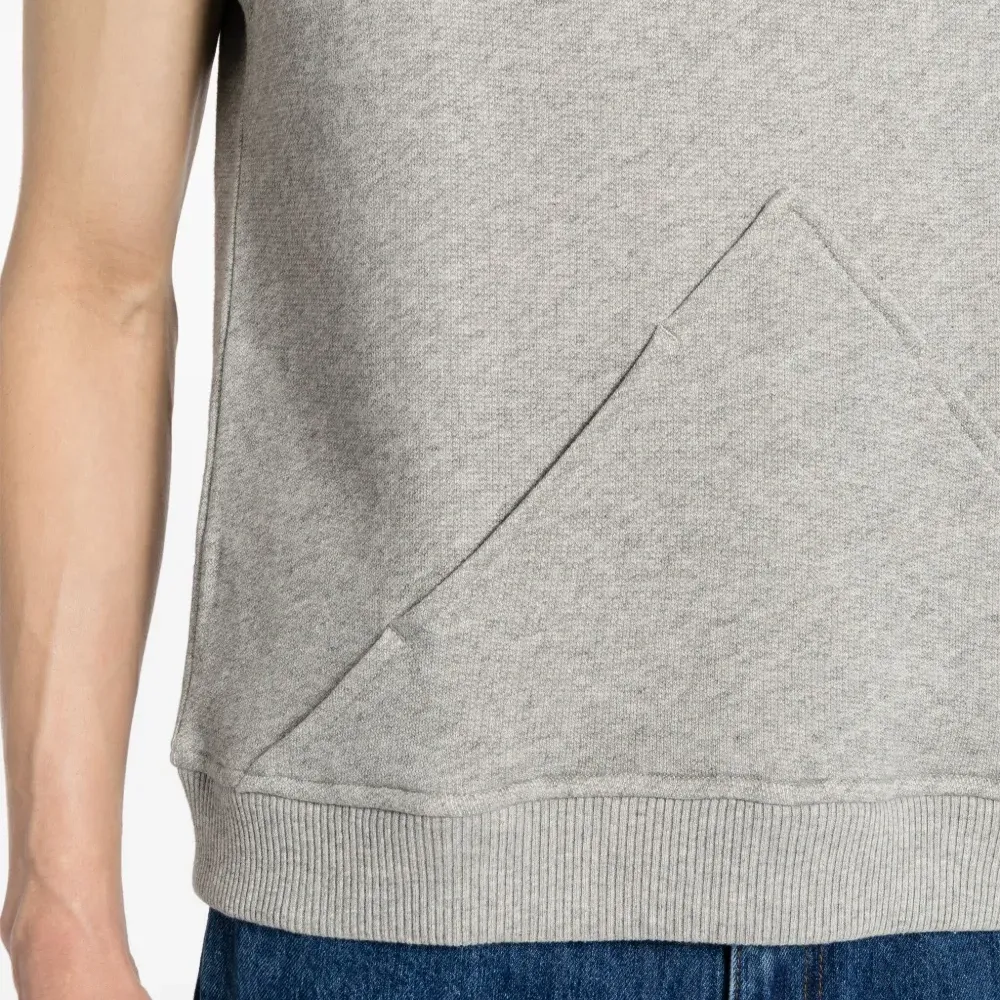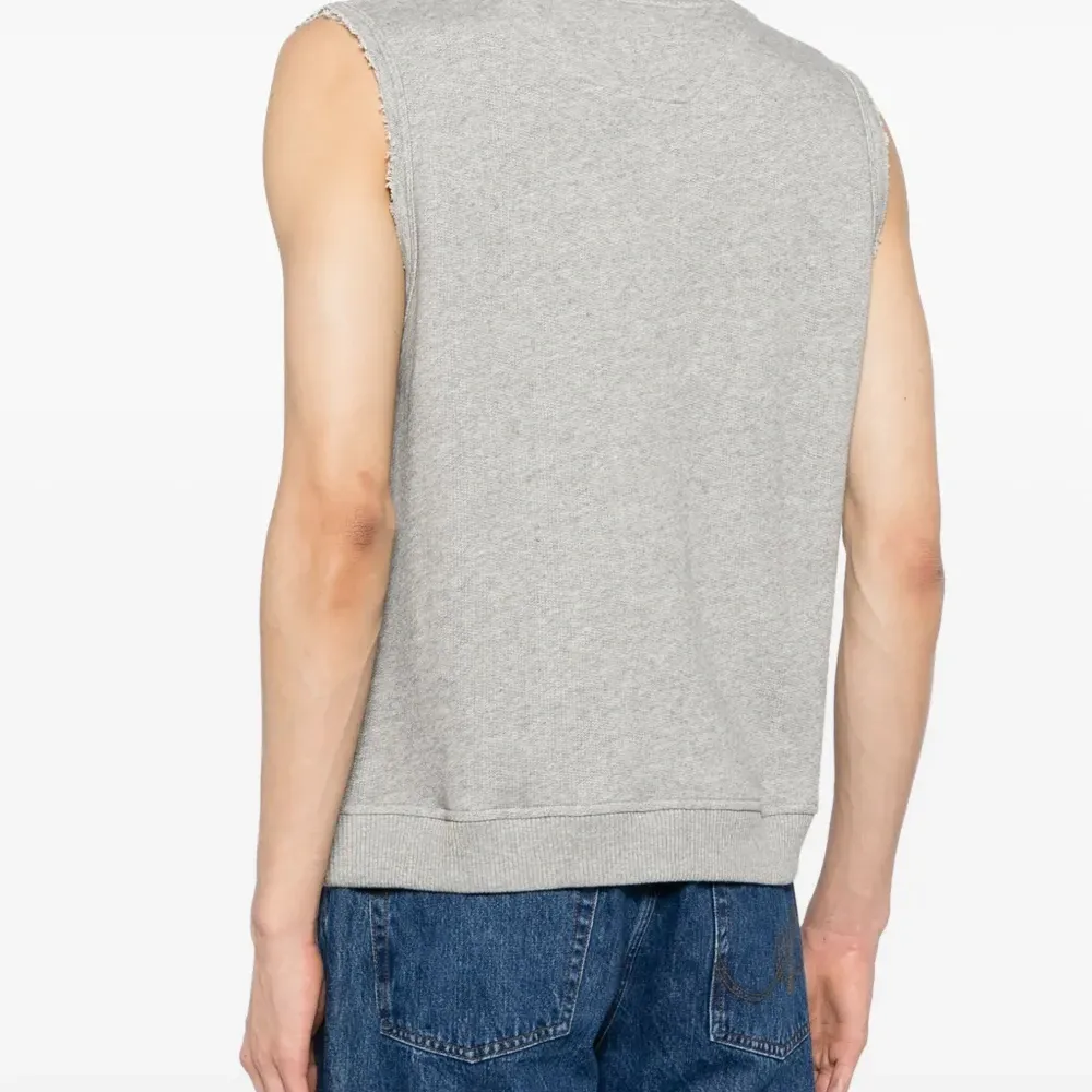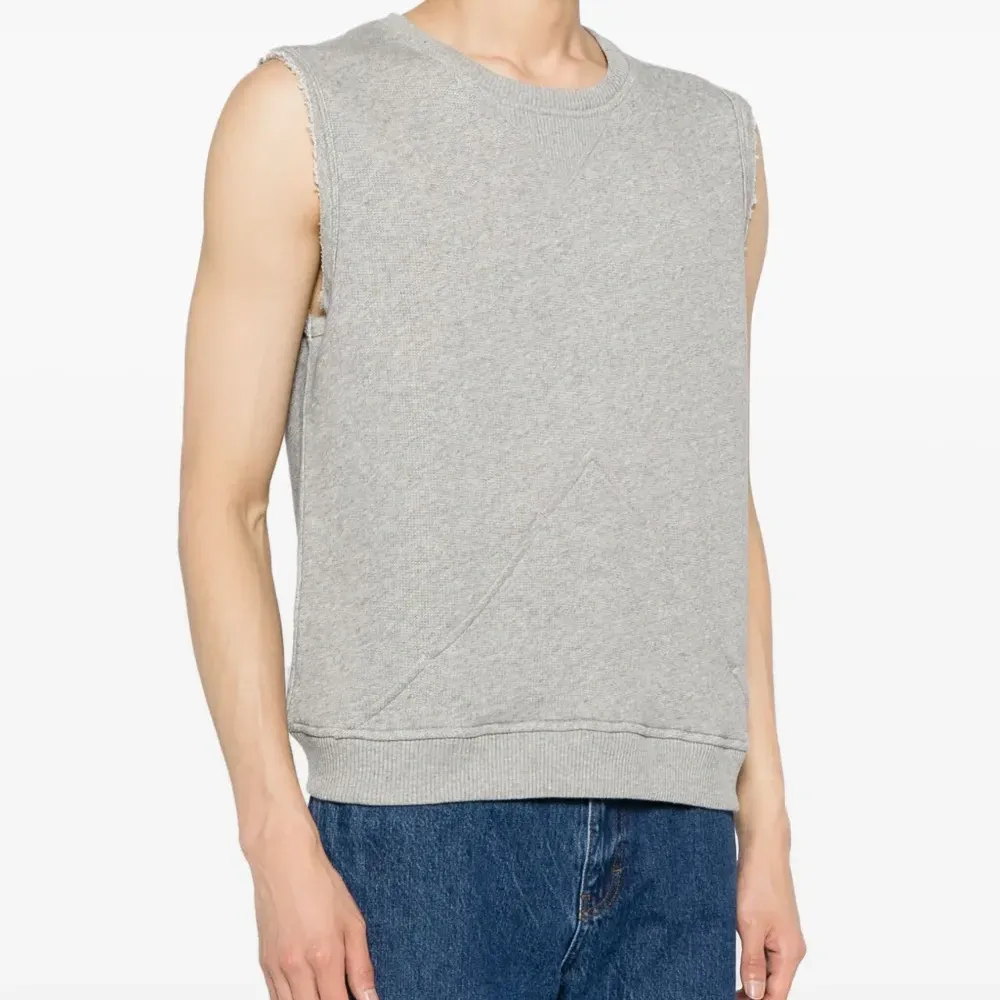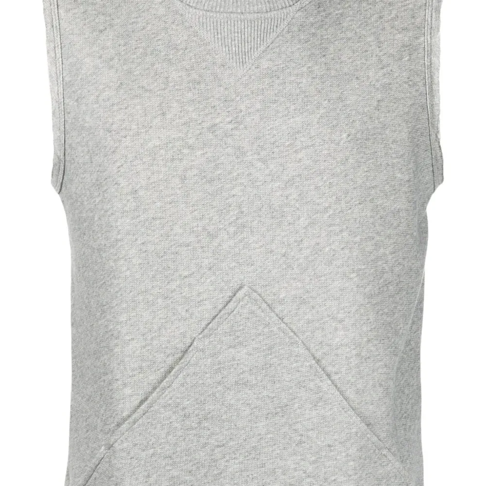 Светло-серый, хлопок, тонкая вязка, вязаные края в рубчик, эффект меланж, декоративные швы, круглый вырез, без рукавов и прямой подол.