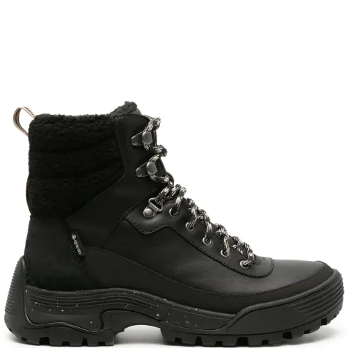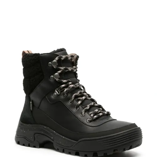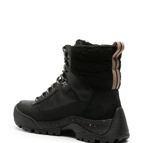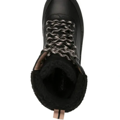 Черный, телячья кожа, отделка из искусственного меха, петля для подтягивания сзади, закругленный носок, шнуровка спереди, высота по щиколотку и плоская резиновая подошва.
