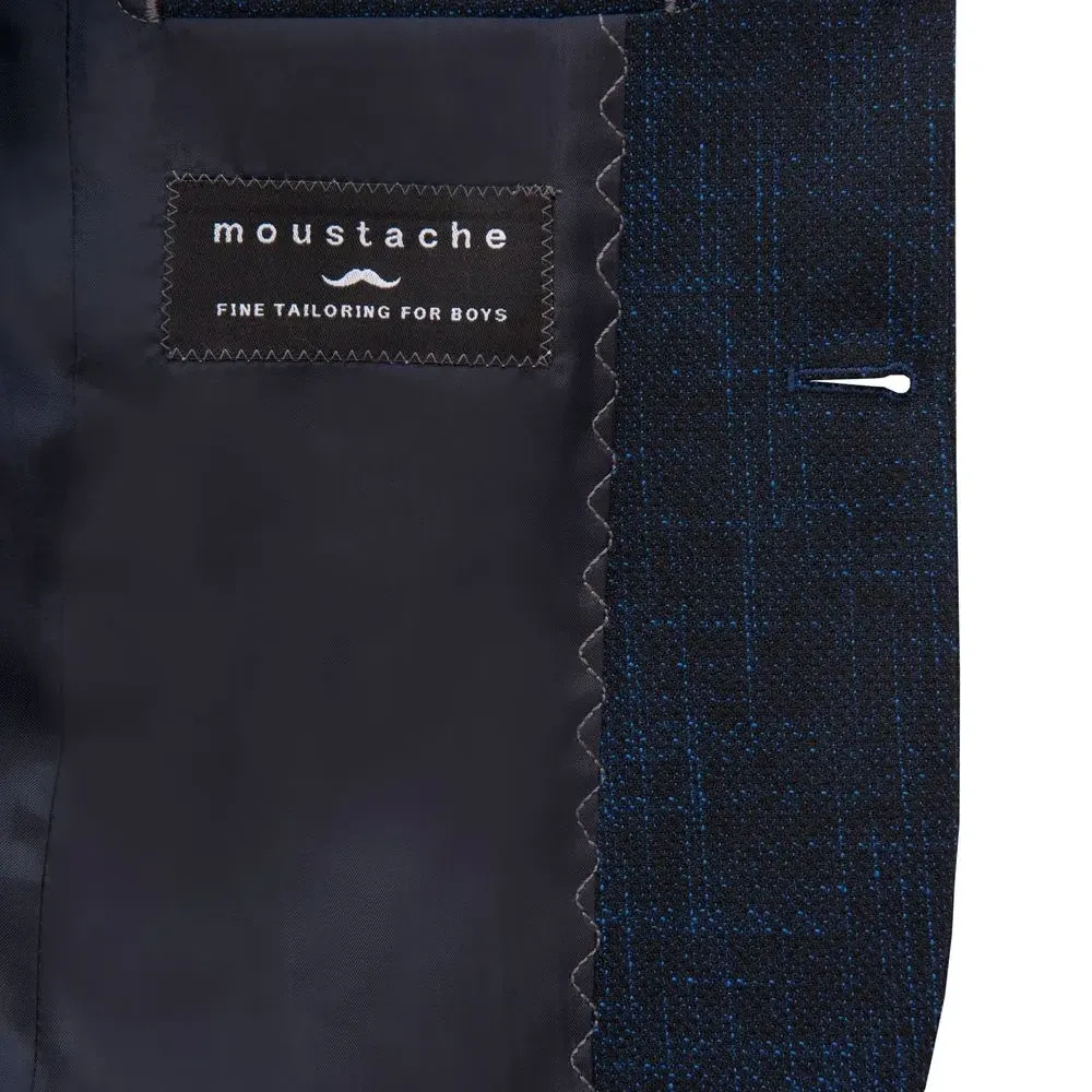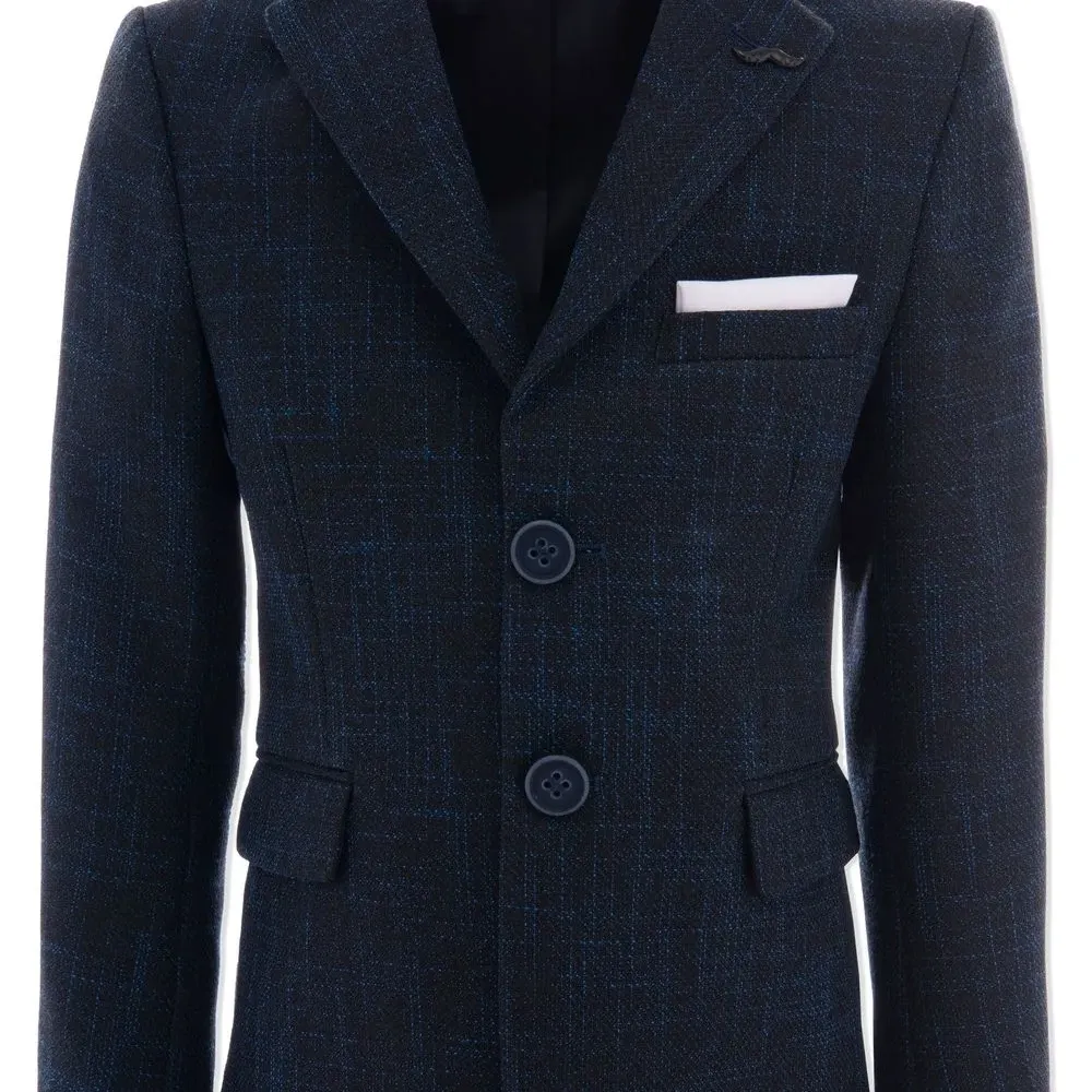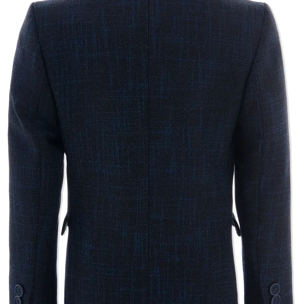 Темно-синий, заостренные лацканы, длинные рукава, два кармана с клапанами по бокам и планка на пуговицах спереди.