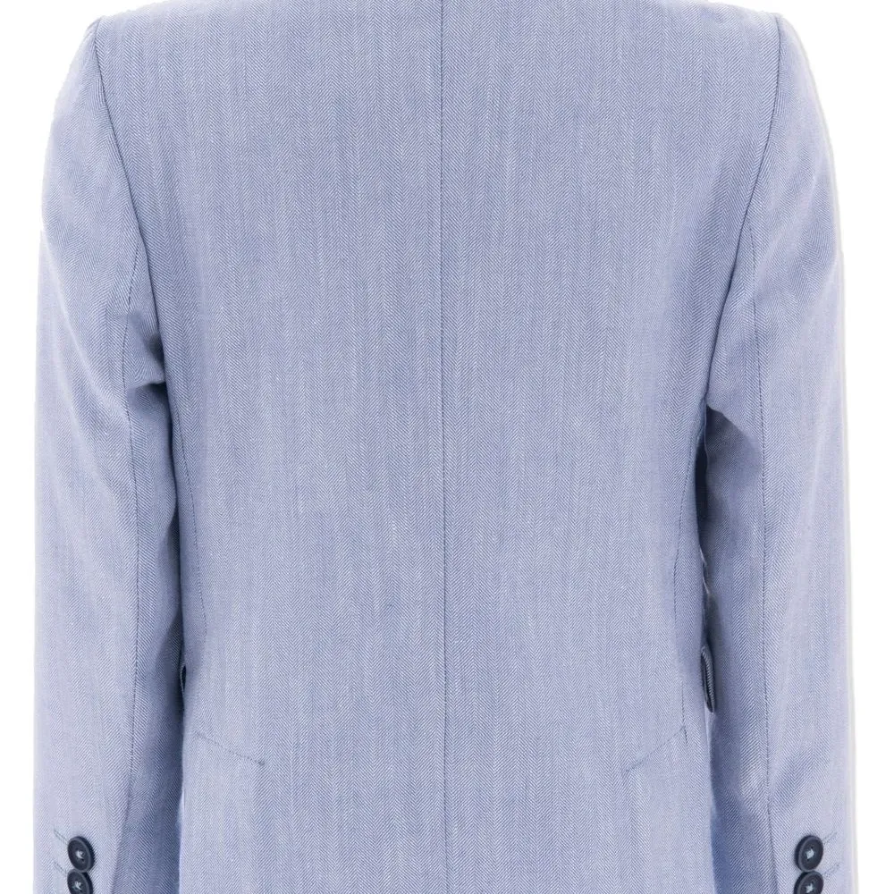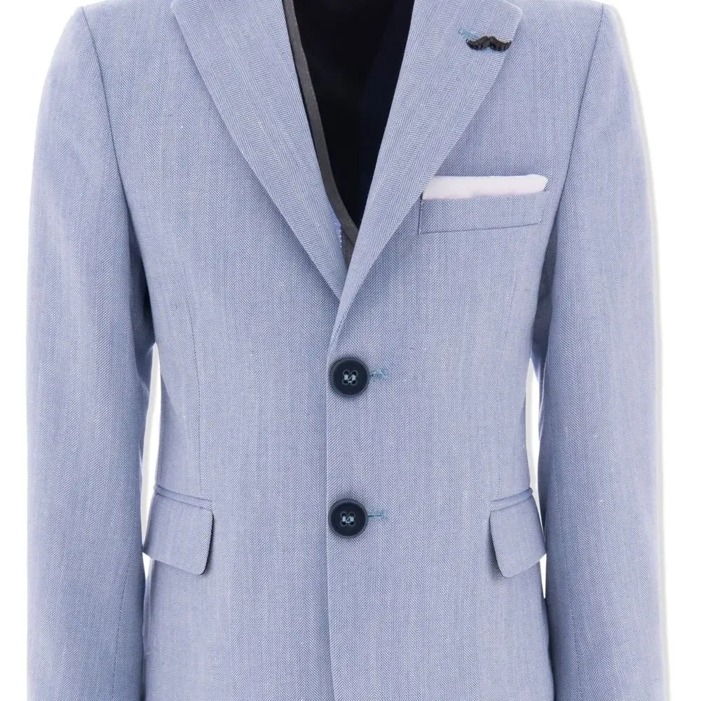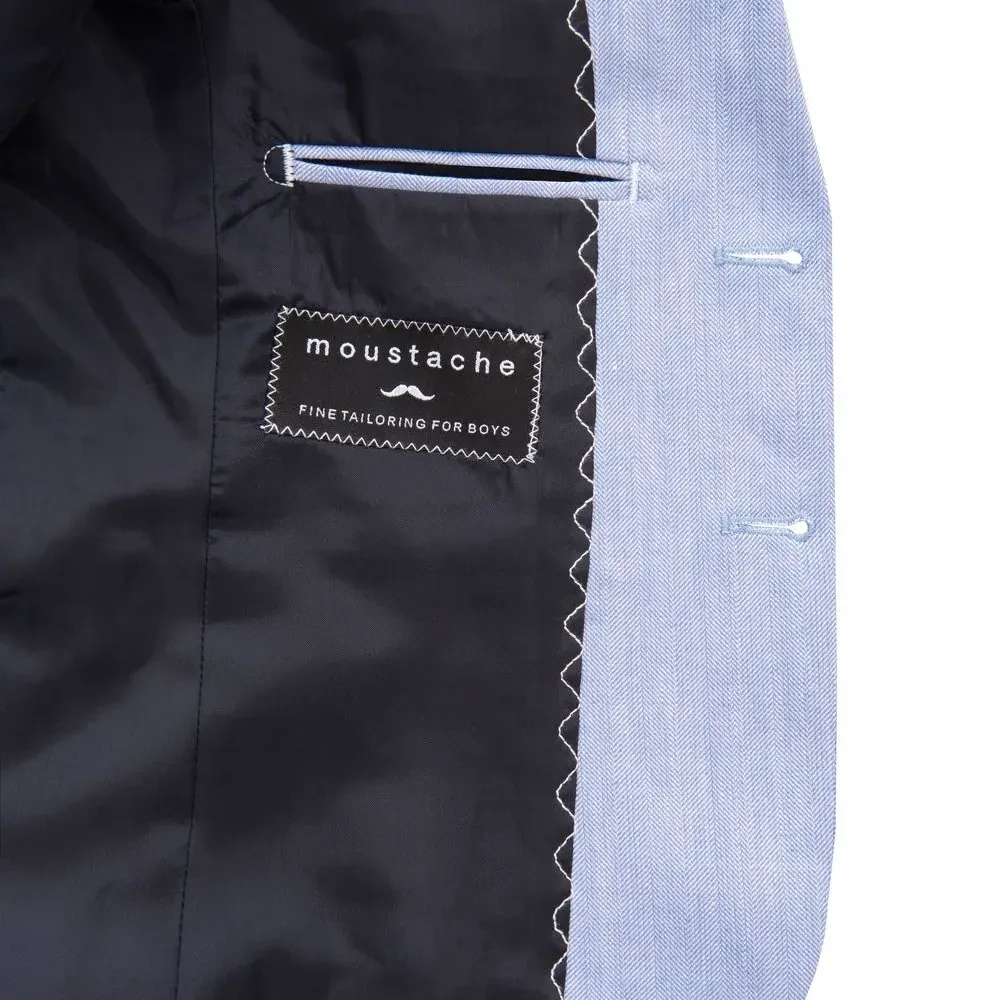 Голубой, ткань с твиловым переплетением, заостренные лацканы, длинные рукава и планка на пуговицах спереди.