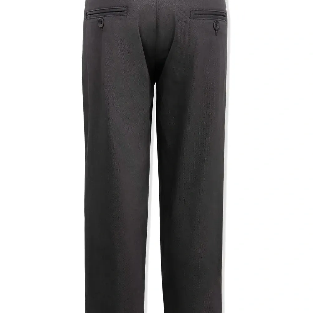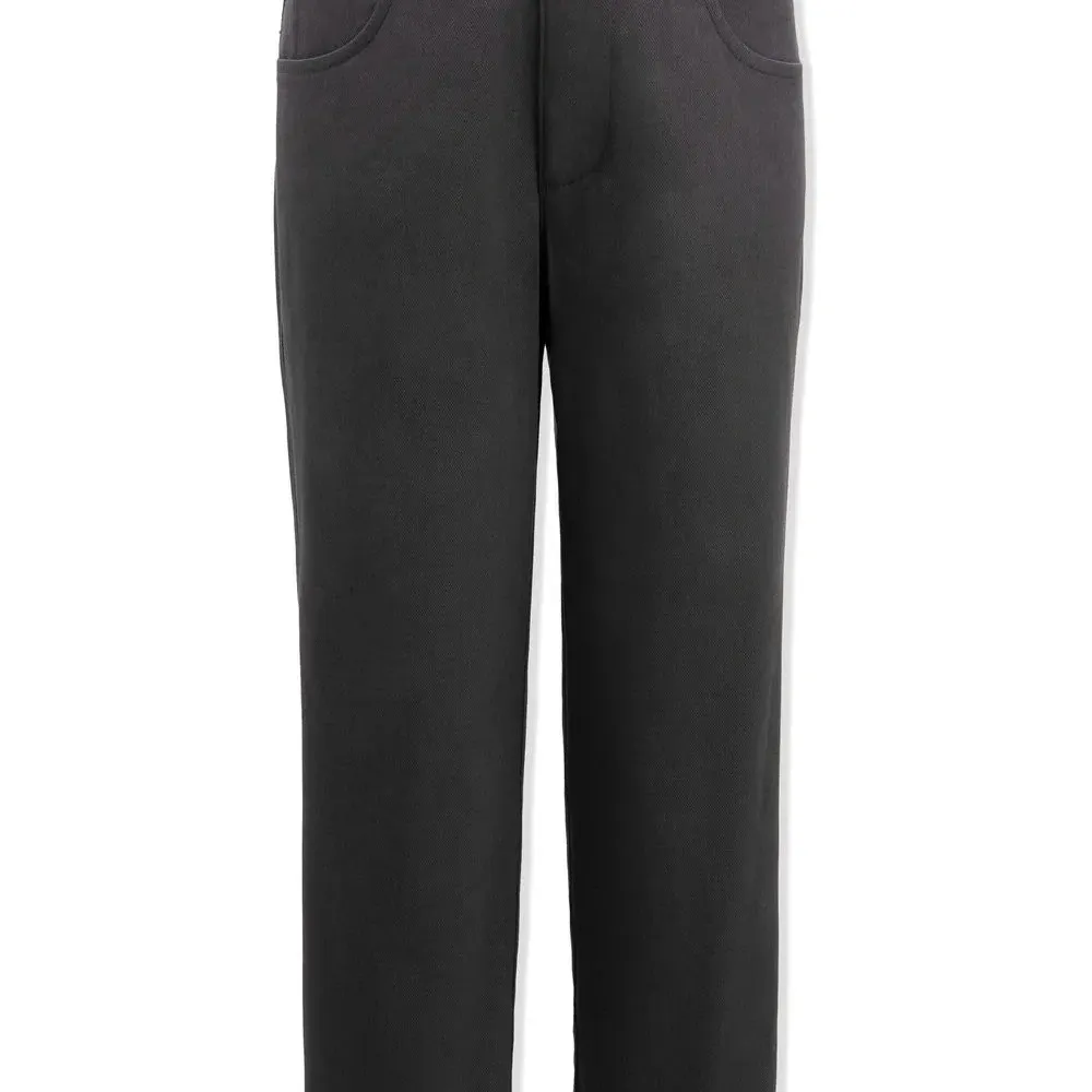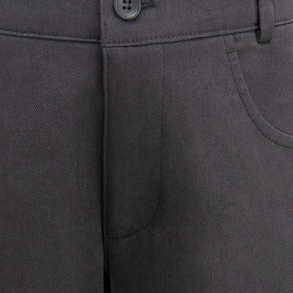 Темно-серый, средняя посадка, ширинка на пуговицах, петли для ремня, пять карманов, прямой крой и строгий крой.