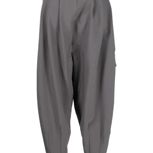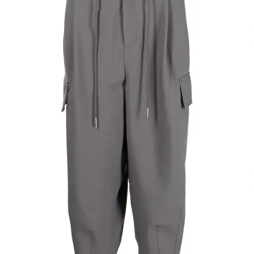 Холодный серый, низкий шаговый шов, потайная застежка на молнии и пуговицах, кулиска на талии, два накладных кармана по бокам и эластичный подол.