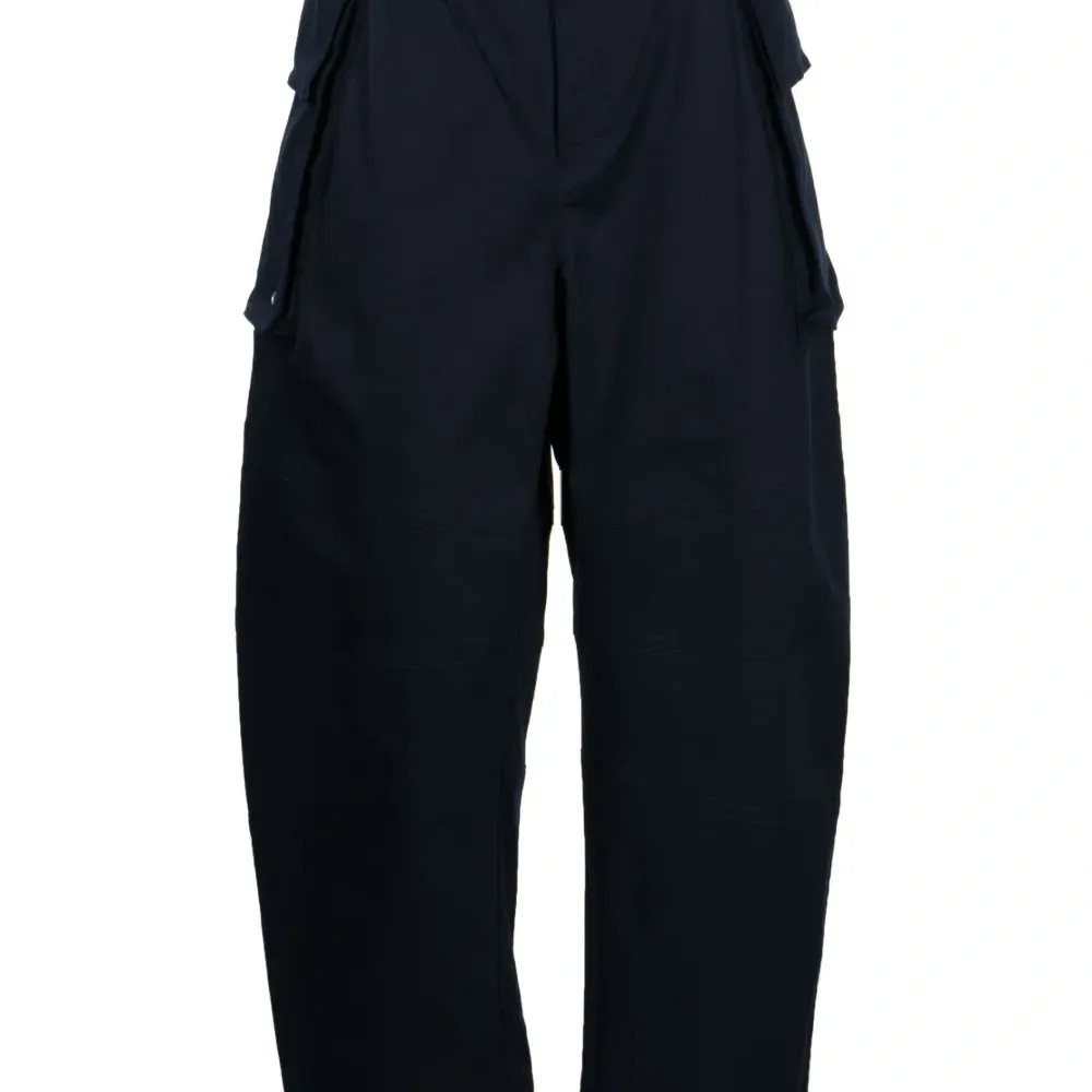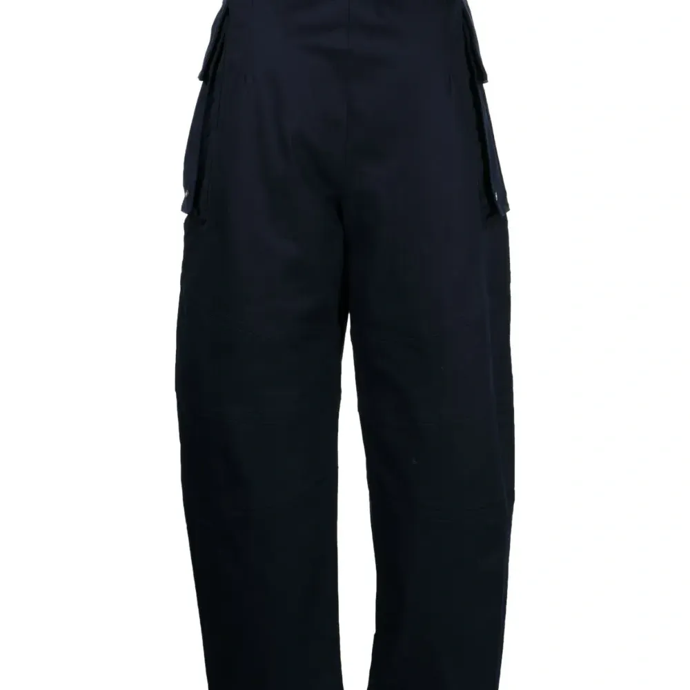 Темно-синий, смесовый хлопок, швы, средняя посадка, эластичный пояс сзади, застежка на кнопки сзади, потайная застежка на молнии и пуговицах, цилиндрическая форма и два кармана с клапанами по бокам.