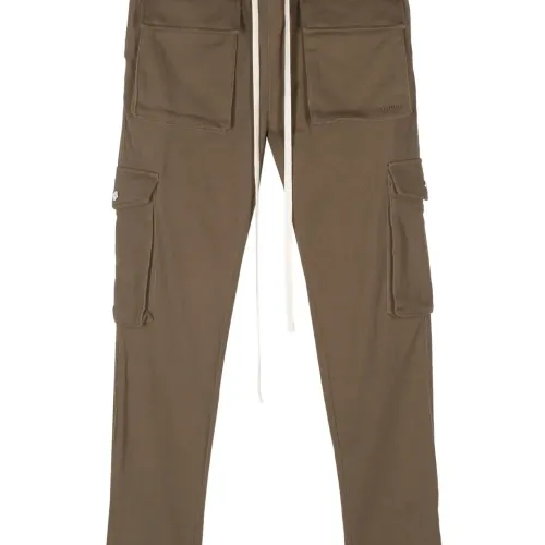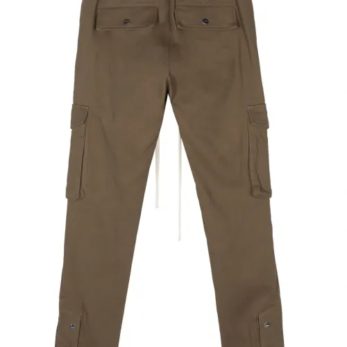 Хаки, эластичный хлопок, вышитый логотип спереди, кулиска на талии, пуговичная застежка сбоку, прямой крой, накладные карманы, два кармана с клапанами сзади и прямой подол.