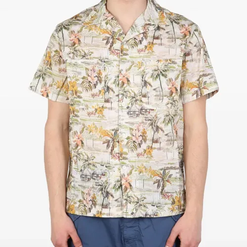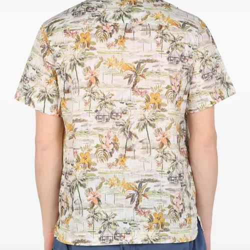 бежевый с цветочным принтом, накладные карманы, короткие рукава, отложной воротник, застёжка на пуговицы