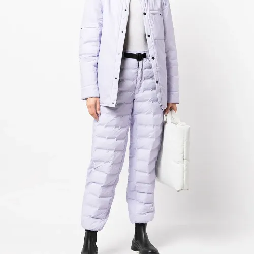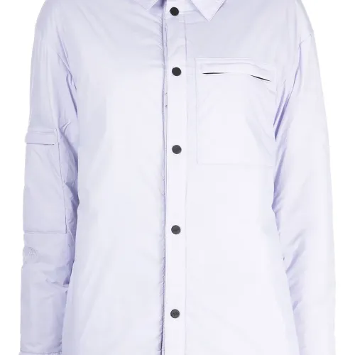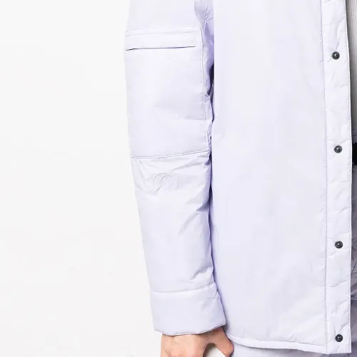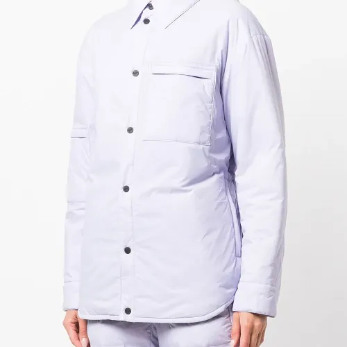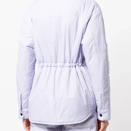 Сирень, дутый материал, классический воротник, два нагрудных кармана на молнии, кулиска на талии, планка на пуговицах спереди, застежка на кнопках спереди, приспущенные плечи, длинные рукава, манжеты на пуговицах и закругленный подол.