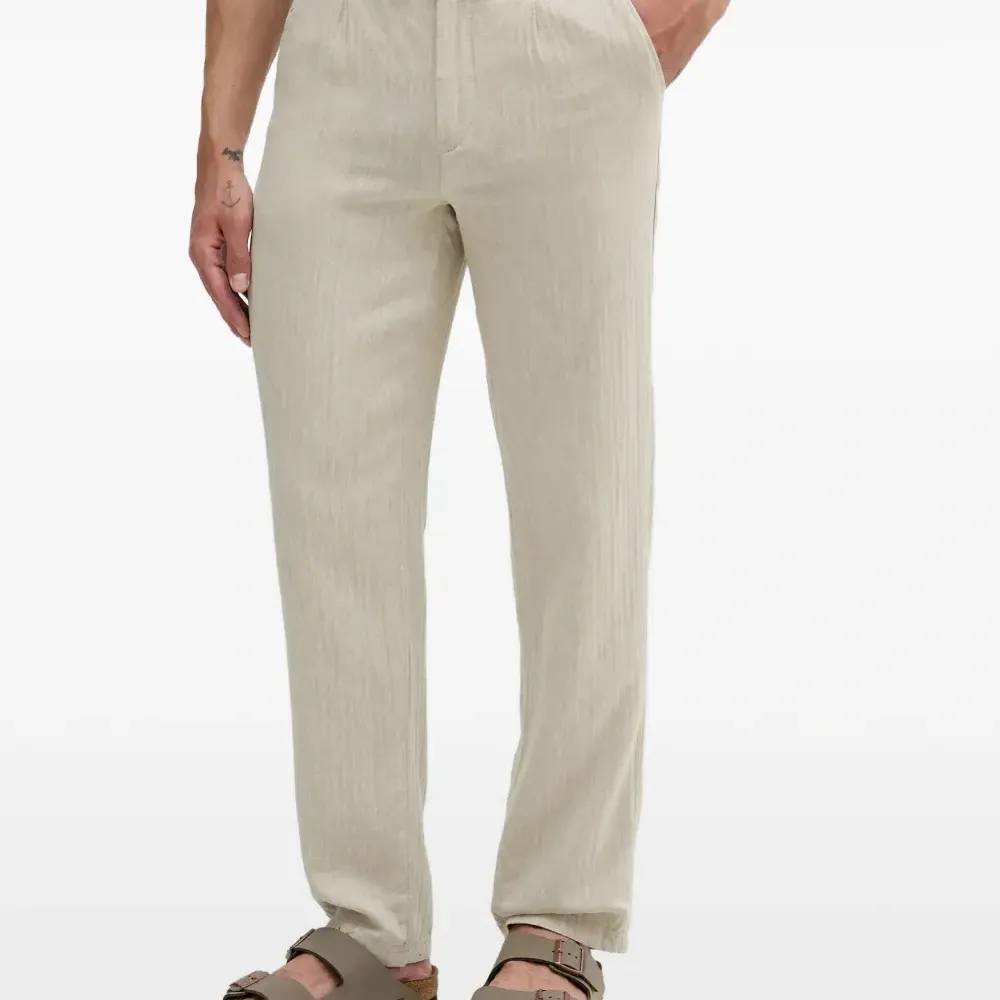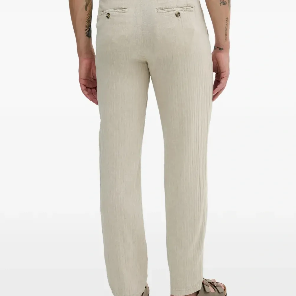 бежевый цвет, ткань с елочкой, завязка на шнурке, шлёвки для ремня, застёжка на пуговицу, задние карманы