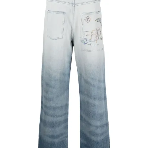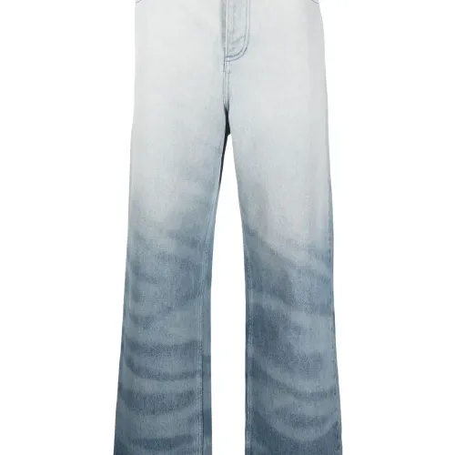 Синий, хлопок, обработанный деним, эффект потертости, нашивка с логотипом сзади, декор из кристаллов, петли для ремня, застежка на молнии и пуговице спереди, пять карманов и широкий крой.