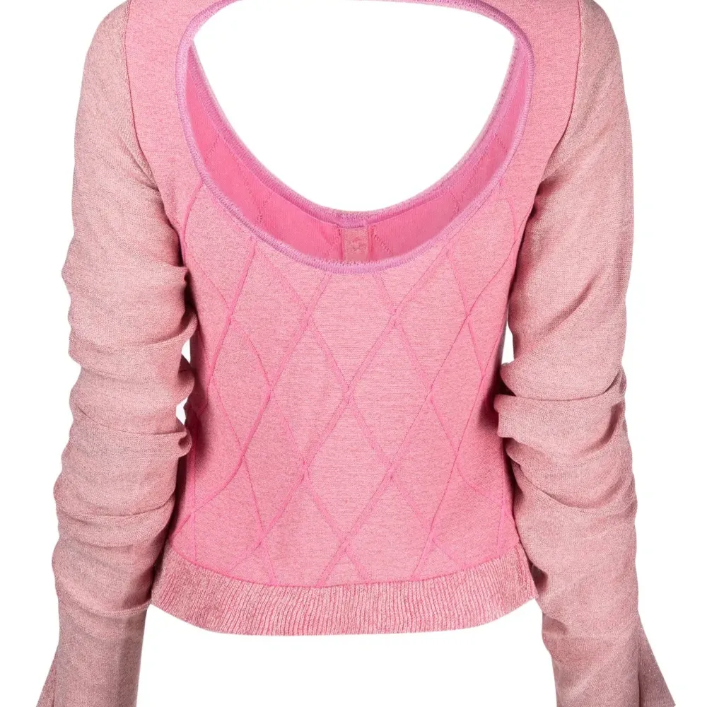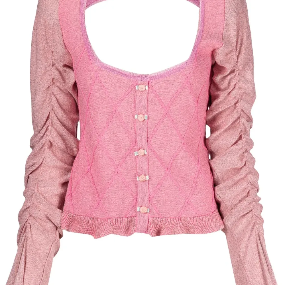 Розовый, пудрово-розовый, смесовый хлопок, тонкая вязка, люрекс, цветочная аппликация, круглый вырез, застежка на пуговицах спереди, открытая спина, длинные рукава с драпировкой и подол с оборками.