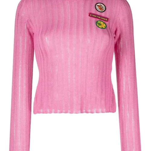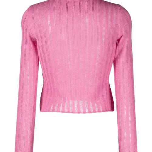 Розовый, смесь кашемира и шелка, декор в виде значка, высокий воротник, длинные рукава и детали в рубчик.