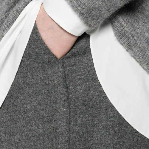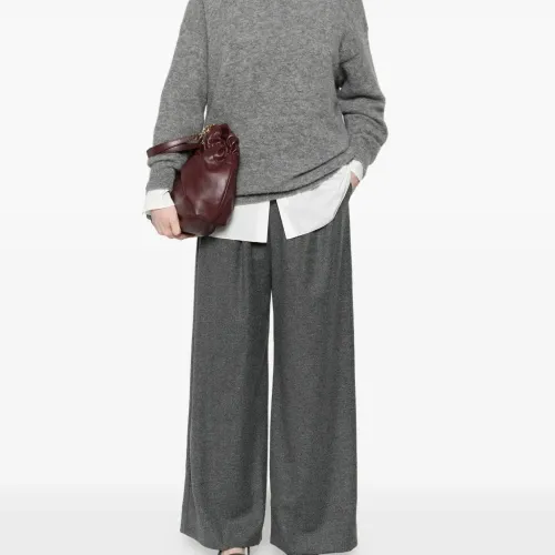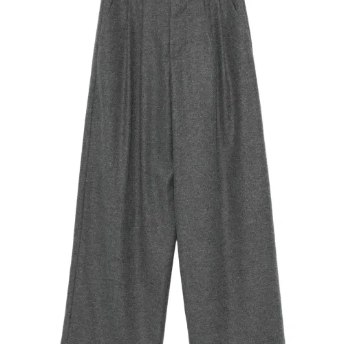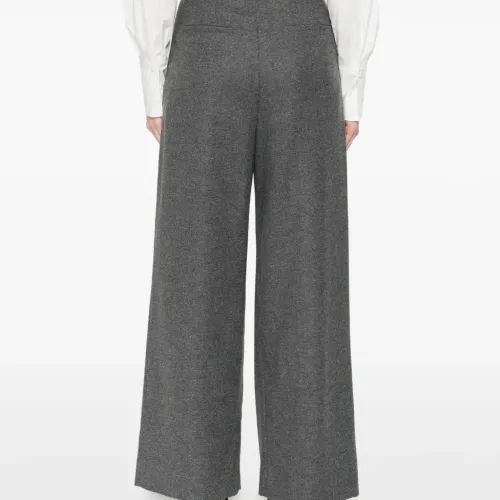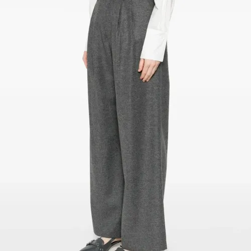 серые брюки с плиссировкой спереди, широкими штанинами, высокой талией, боковыми карманами и прямым краем