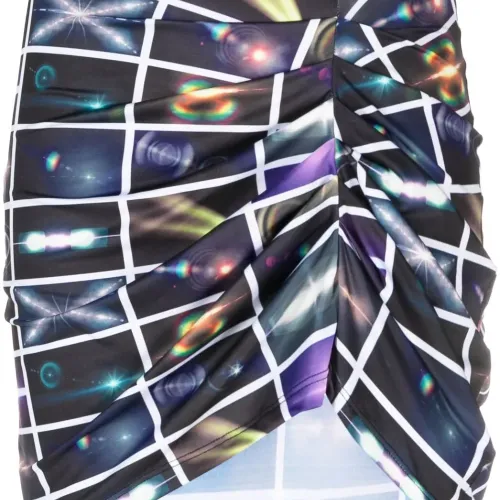 Черный/разноцветный, эластичный материал, сплошной графичный принт, клетчатый узор, детали с оборками, завышенная талия, облегающий крой и длина до бедер.
