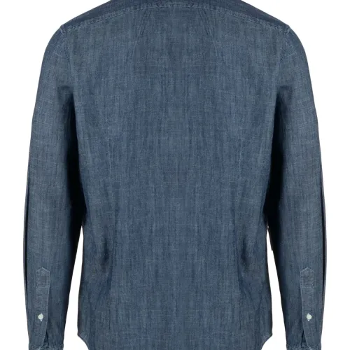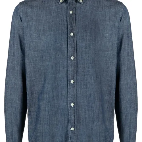 Темно-синий, хлопок, воротник на пуговицах, застежка на пуговицах спереди, длинные рукава, рукава с манжетами на пуговицах и закругленный подол.